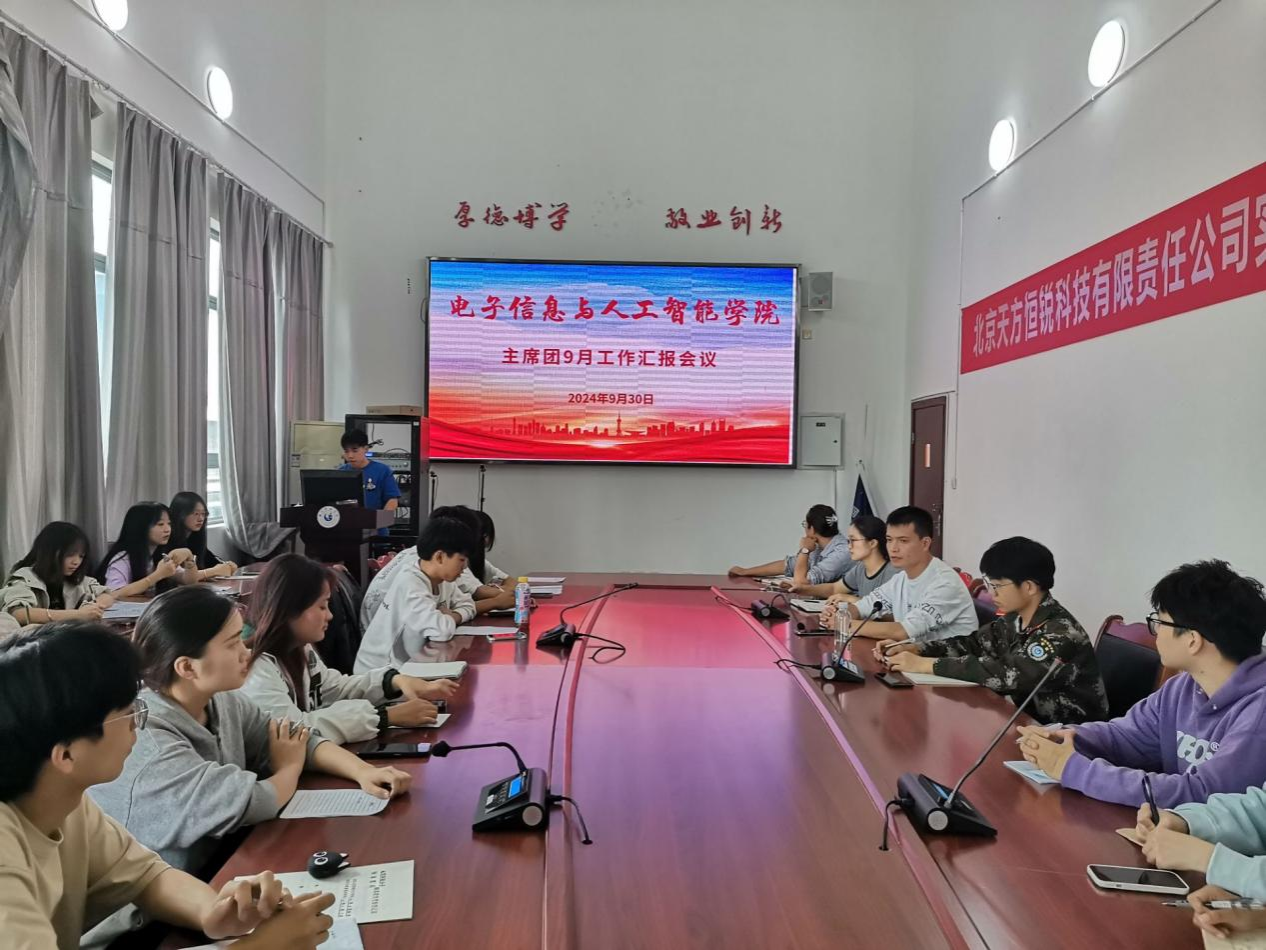 本网讯(文/张宇昊、图/郭正兴)为进一步提高主席团各部门工作效能,强化学院团学队伍建设,促进学生工作有序开展。9月30日,电子信息与人工智能学院在特教c501举行主席作汇报会议。本次会议由AI之家辅导员工作室主办,分团委书记强光平,辅导员肖苗、狄红霞、王杰,主席团和学生助理全体成员共同参与。
