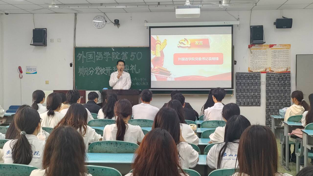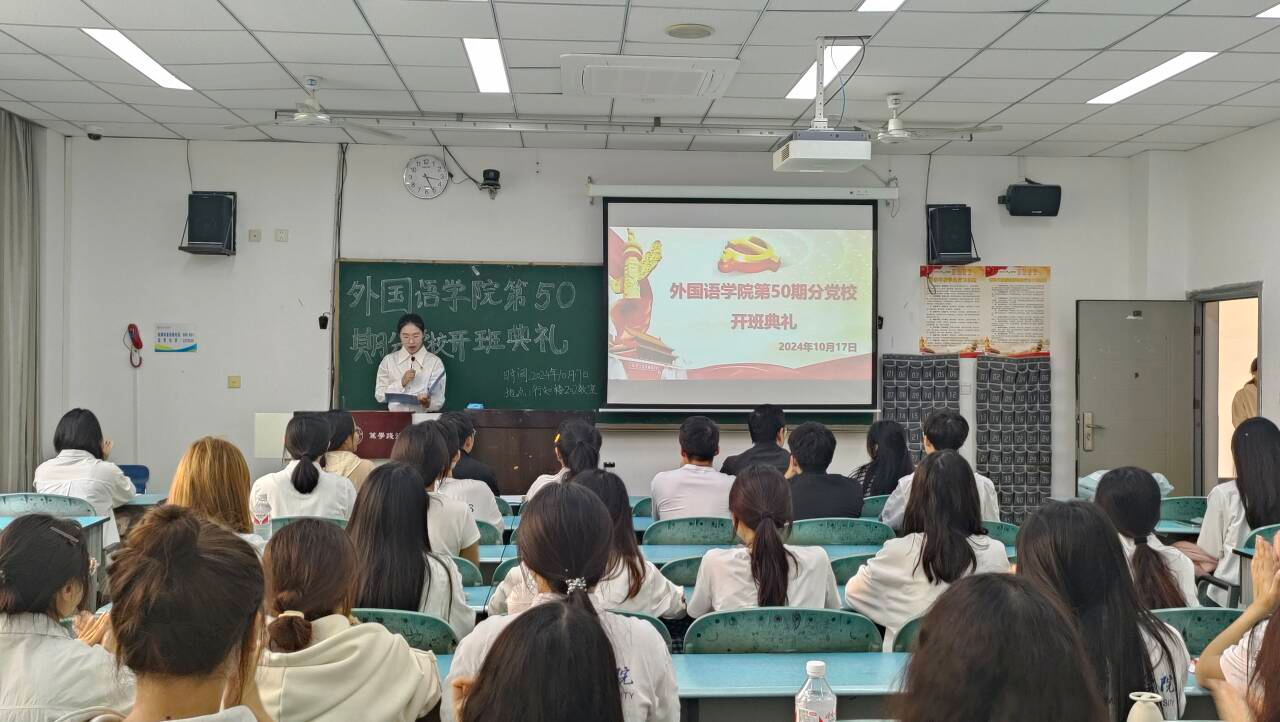 本网讯(文/杨冰羽 图/赵丰铃)金秋十月,秋风送爽。为提升入党积极分子政治理论水平和思想道德修养,铭记入党初心。10月17日,外国语学院第50期分党校开班典礼在行知楼202教室举行。外国语学院党委书记袁明锋、专职组织员曹琳、学生党支部书记王旺兵、李振岗、陶爽、预备党员以及本期51名入党积极分子参加。