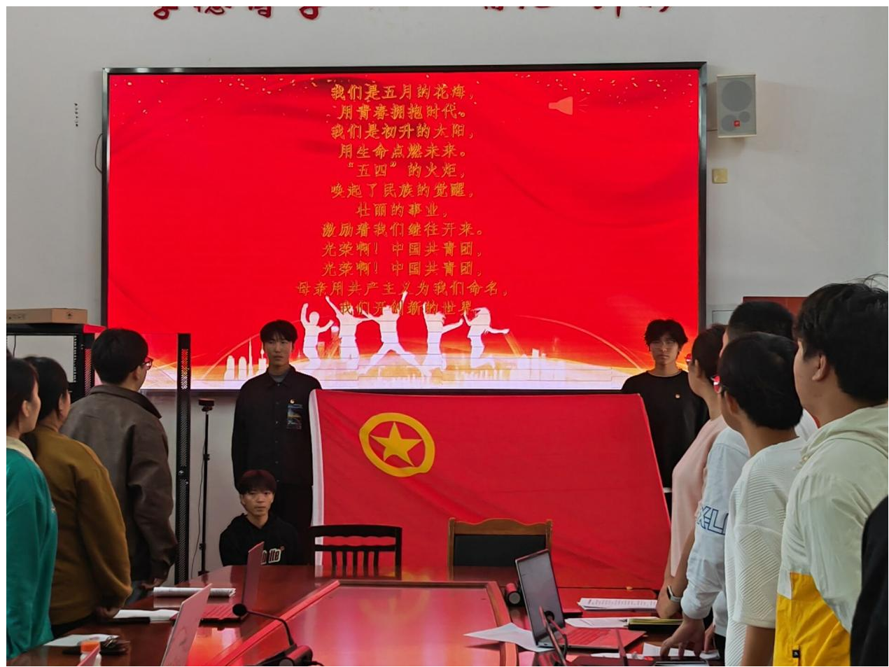 会议伊始,全体成员起立,迎接团旗,高唱团歌。强光平宣读了《电子信息与人工智能学院学生团员发展工作实施办法(试行)》,强调学生团员作为学院青年学生的骨干力量,应具备坚定的理想信念、良好的道德品质和突出的综合素质,为学院的发展贡献自己的力量。王杰强调了会议纪律,要求全体参会人员严格遵守会议纪律,保持会场秩序,认真听取各项议程,确保会议顺利进行,要求大家秉持公平、公正、公开的原则,共同推动新发展团员评选工作的顺利开展。