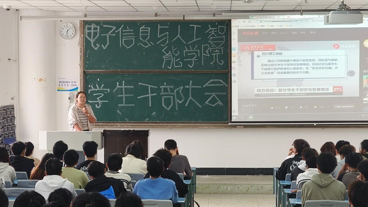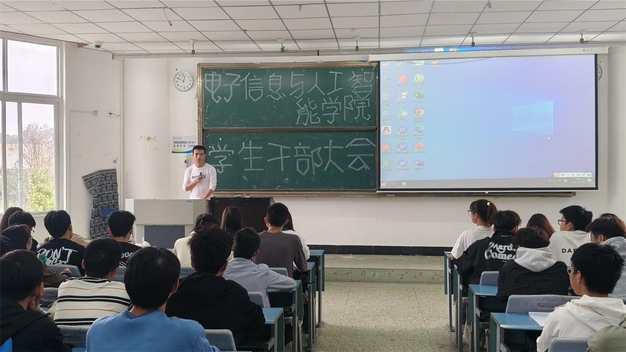 本网讯(文/欧阳玉熙 图/何喜悦)10月20日,电子信息与人工智能学院学生干部大会在行知楼314召开。本次会议由AI之家辅导员工作室主办,由分团委书记强光平,辅导员狄红霞和学院全体学生干部共同参与。