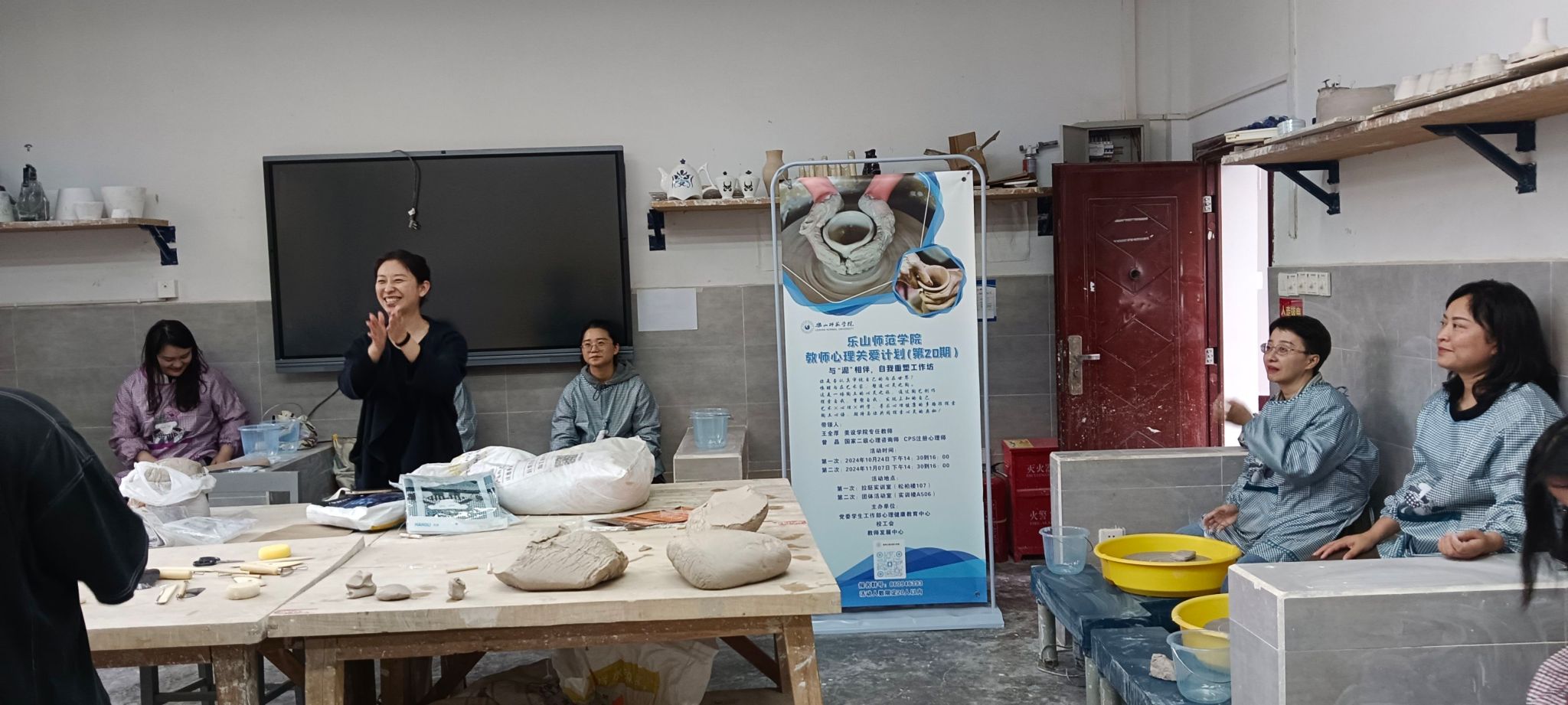 本网讯(文、图/舒新雨)为丰富我校教师心理健康生活,增加教师的积极心理体验,为进一步提升教师心理健康水平,关爱教师身心健康,10月24日下午,心理健康教育中心在松柏楼108拉胚实训室开展了主题为“与‘泥’相遇,自我重塑”的教师心理关爱活动。活动旨在帮助参与者觉察自我,与内在自我联结,进行积极自我重塑。活动由美设学院专任教师王全厚和心理健康教育中心专职教师曾晶共同带领。