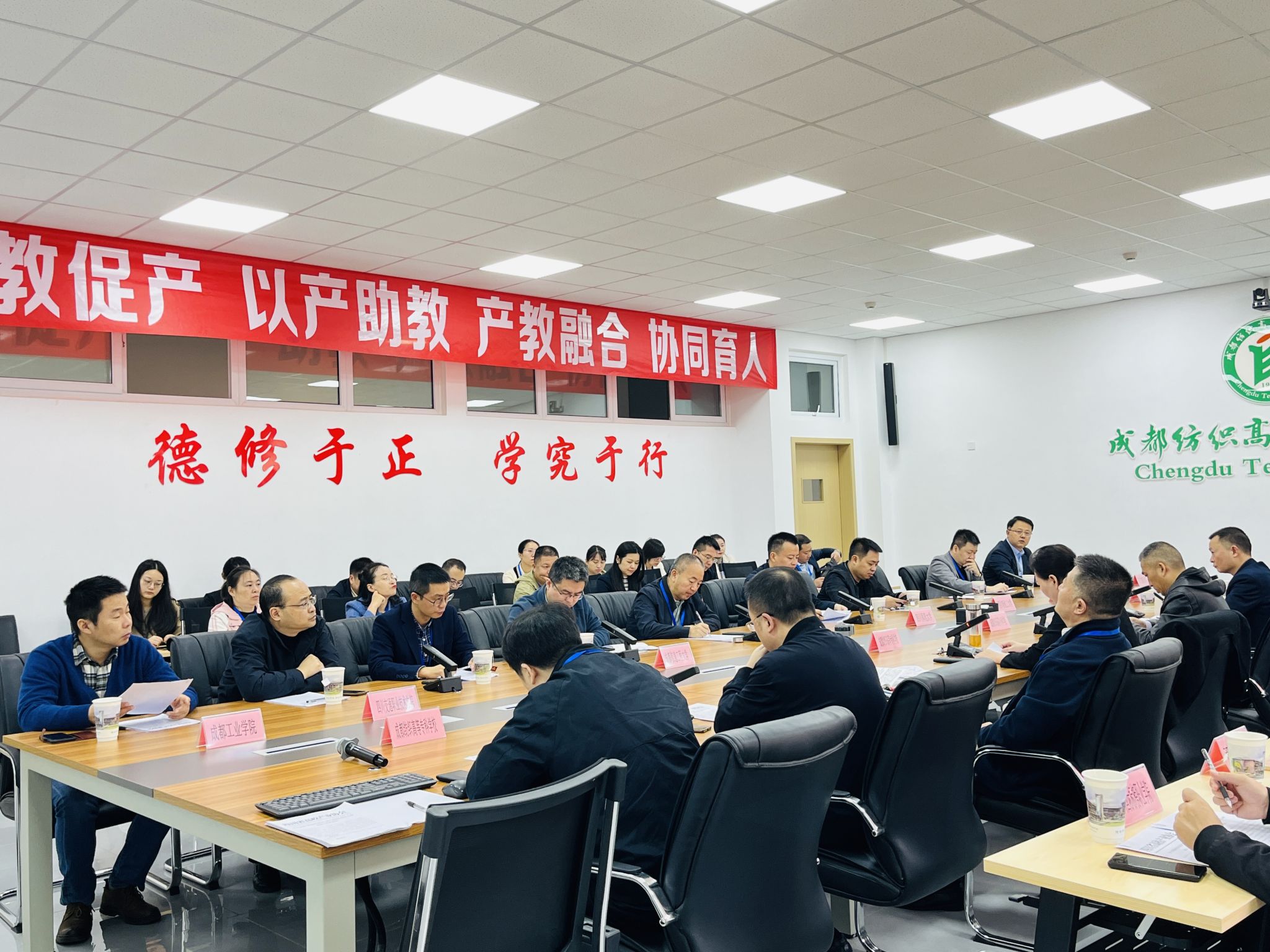 参观结束后,产教融合座谈会在成都纺织高等专科学校第二会议室召开。会上,成都纺织高等专科学校党委常委、副校长刘莉致欢迎辞,产教融合专委会主任、成都纺专资产公司总经理陈俊明分享了学校资产公司的产教融合项目发展经验,四川省高校产业协会副会长罗俊组织了“四川省高校产业协会产教融合示范项目推送方案”讨论会。座谈会还组织观看了邛崃市旅游宣传片。