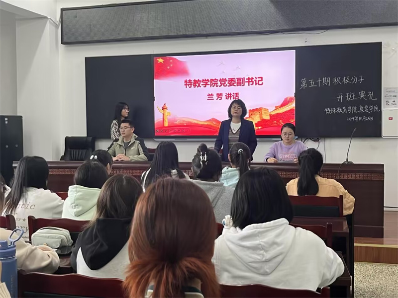 特殊教育学院党委副书记兰芳讲话。她首先对第50期新列为入党积极分子的同学们表示了热烈的欢迎和祝贺,其次她强调了入党积极分子培养的重要性和意义。她还指出,入党积极分子是党的后备力量,是党的未来和希望,希望大家能够珍惜这次学习机会,不断提高自己的政治觉悟和理论水平,积极向党组靠拢,为早日成为一名合格的共产党员打下坚实的基础。