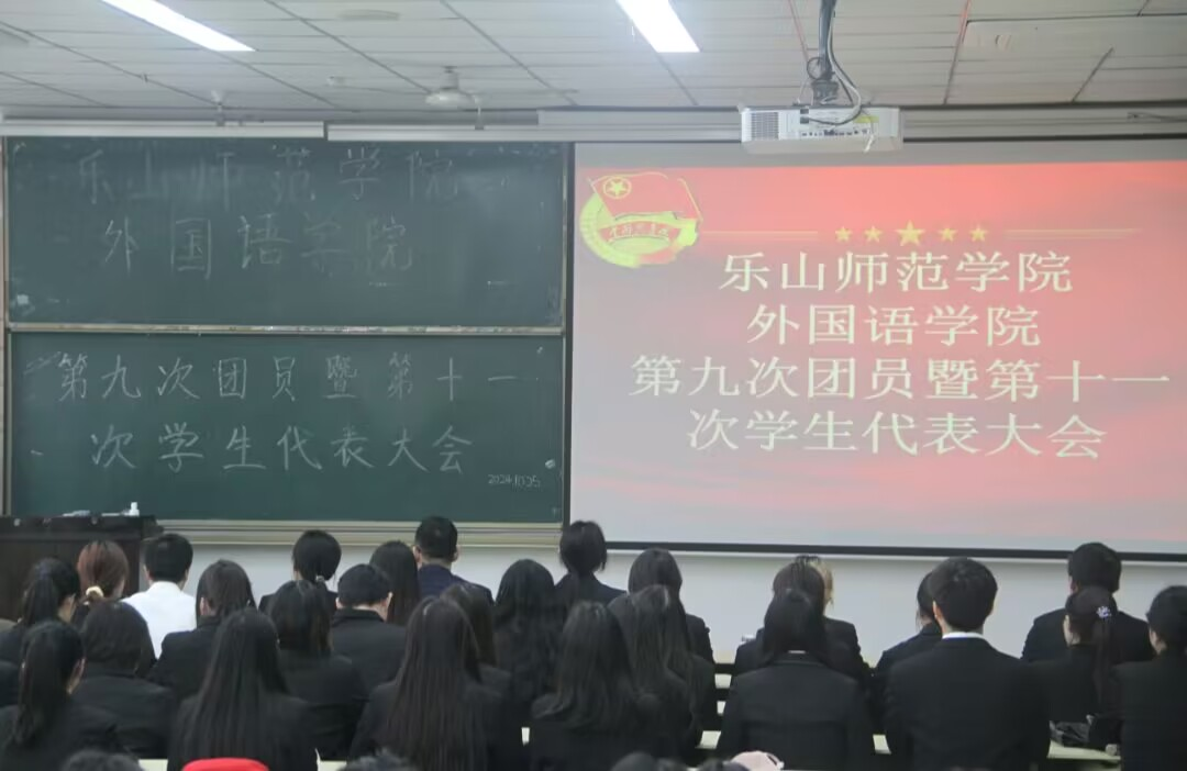 本网讯(文/彭维娇 图/谢颖霖)10月25日,外国语学院于行知楼125室召开共青团外国语学院第九次团员代表大会暨外国语学院第十一次学生代表大会。学院党委书记袁明锋、专职组织员曹琳,辅导员王旺兵、陶爽、李振岗以及162名学院团学代表参与了本次大会。