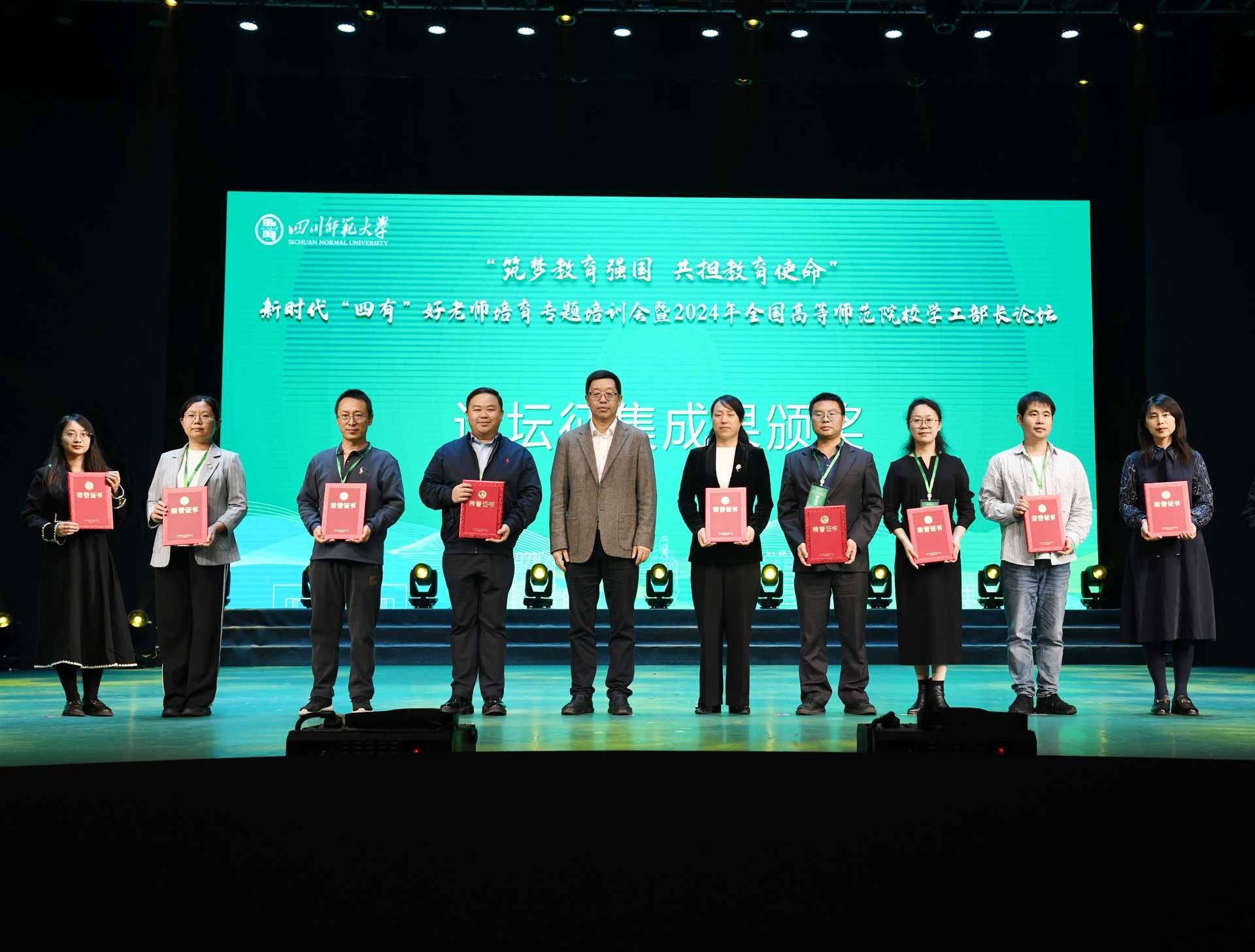 本网讯(文、图/杨好雨)近日,“筑梦教育强国 共担教育使命”新时代“四有”好老师培育专题培训会暨2024年全国高等师范院校学工部长论坛在四川师范大学狮子山校区举行。我校党委学生工作部部长黄显刚、副部长胡平建,新能源材料与化学学院副书记胡涛,思政科科长谭妙参加此次论坛,与来自全国的参会代表互相交流,深入研讨。