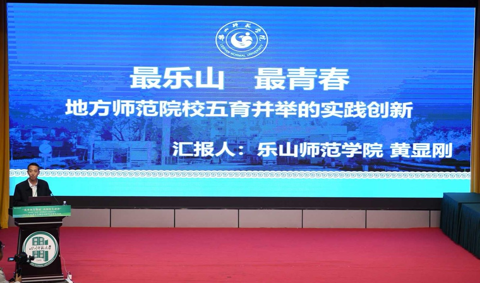 在交流环节,十所高师院校参与主旨发言,我校作为四川省地方师范院校中的代表。党委学生工作部部长黄显刚以《最乐山,最青春—地方师范院校五育并举的实践创新》为题,围绕学院“五育并举”实践创新作主旨发言。他从人文之光、民族之花、山水之美、美食之城四个方面详细介绍了乐山师范学院以本土文化为滋养,做好五育融合,为铸就“最乐山,最青春”思想政治教育新篇章所采取的有效举措,受到了与会代表的积极好评。