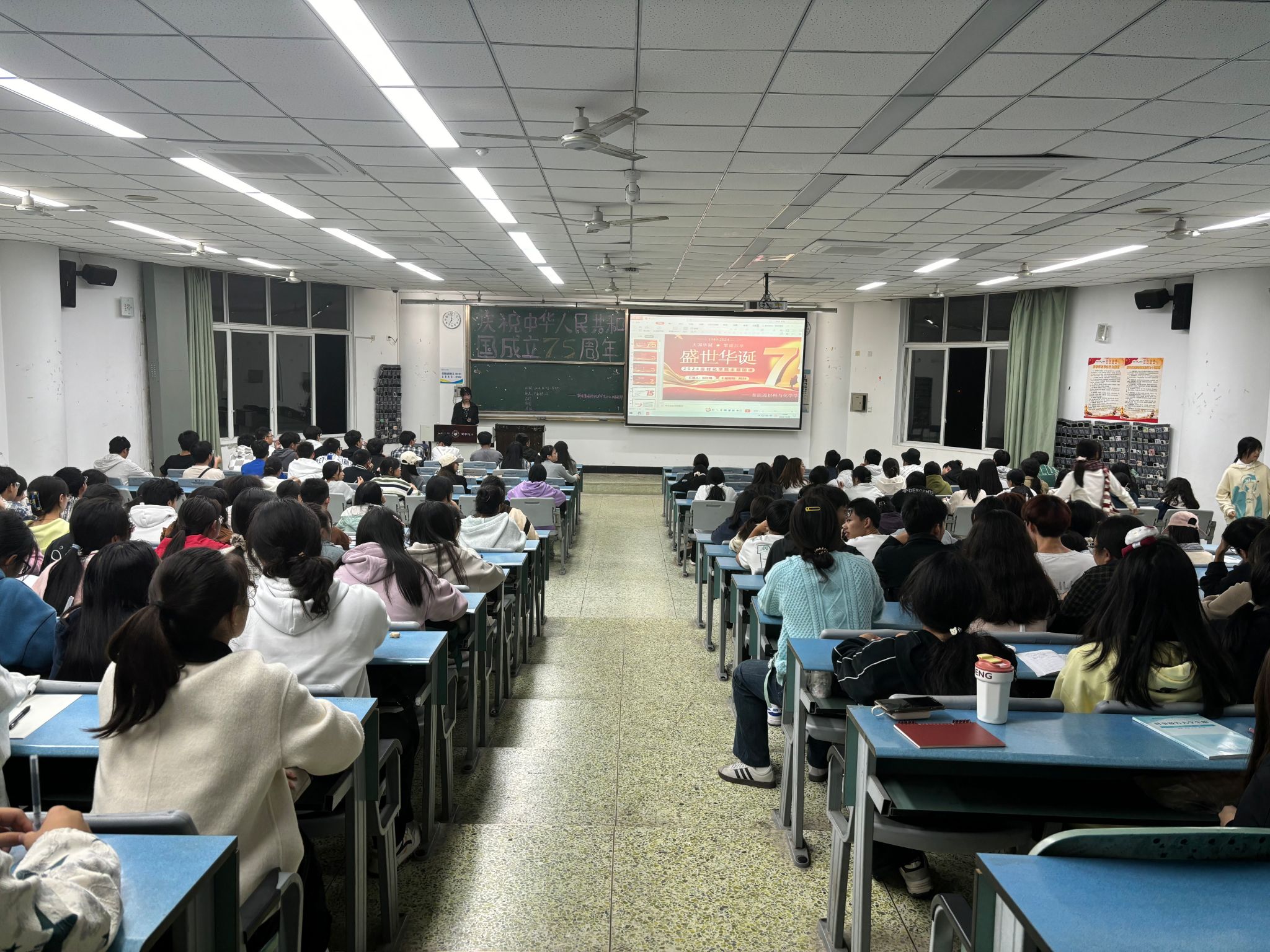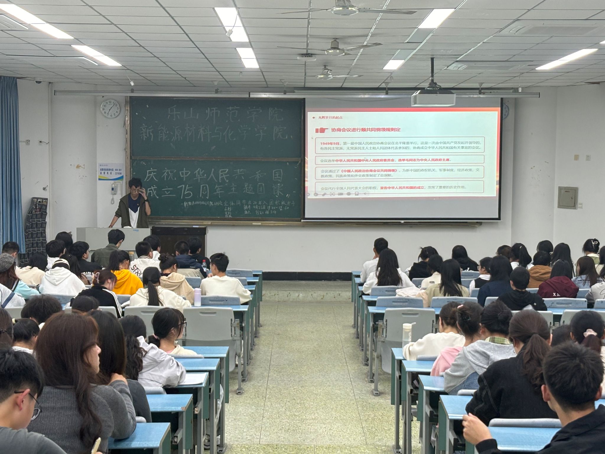 本网讯(文/孙铭霞,冉茂裕 图/孙铭霞 )为庆祝中华人民共和国成立75周年,引导广大青年团员深刻理解爱国主义的内涵要义,筑牢爱国主义的思想根基,10月25日晚,新能源材料与化学学院分团委在行知楼214室和314室组织开展了“庆祝中华人民共和国成立75周年”主题团课。本次团课由24级材料专业刘红梅同学主持,团课重点围绕“光辉岁月的起点”、“文化薪火永相传”、“回首往昔的成就”和“团结共创新辉煌”四个章节展开。