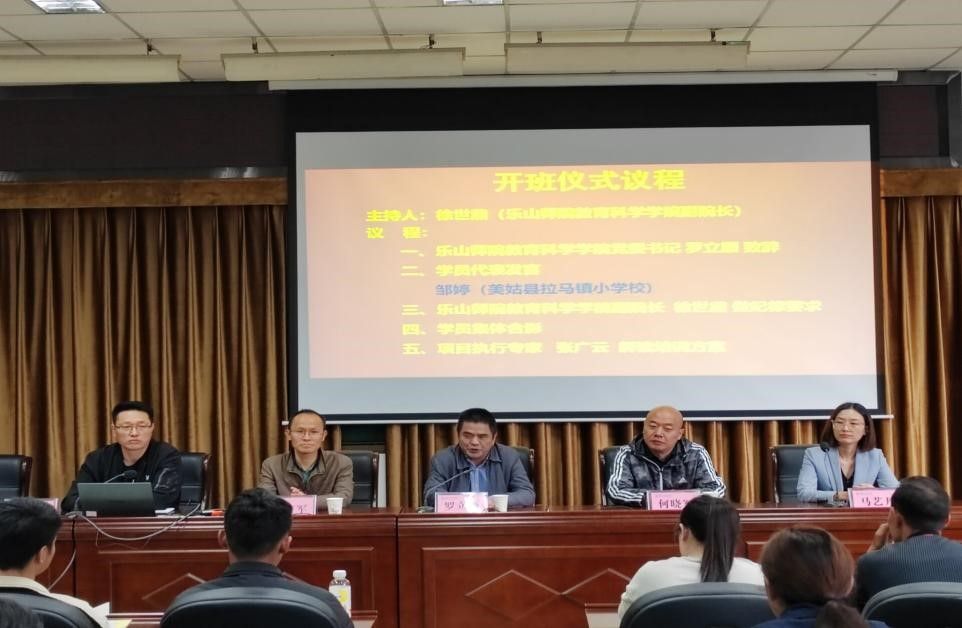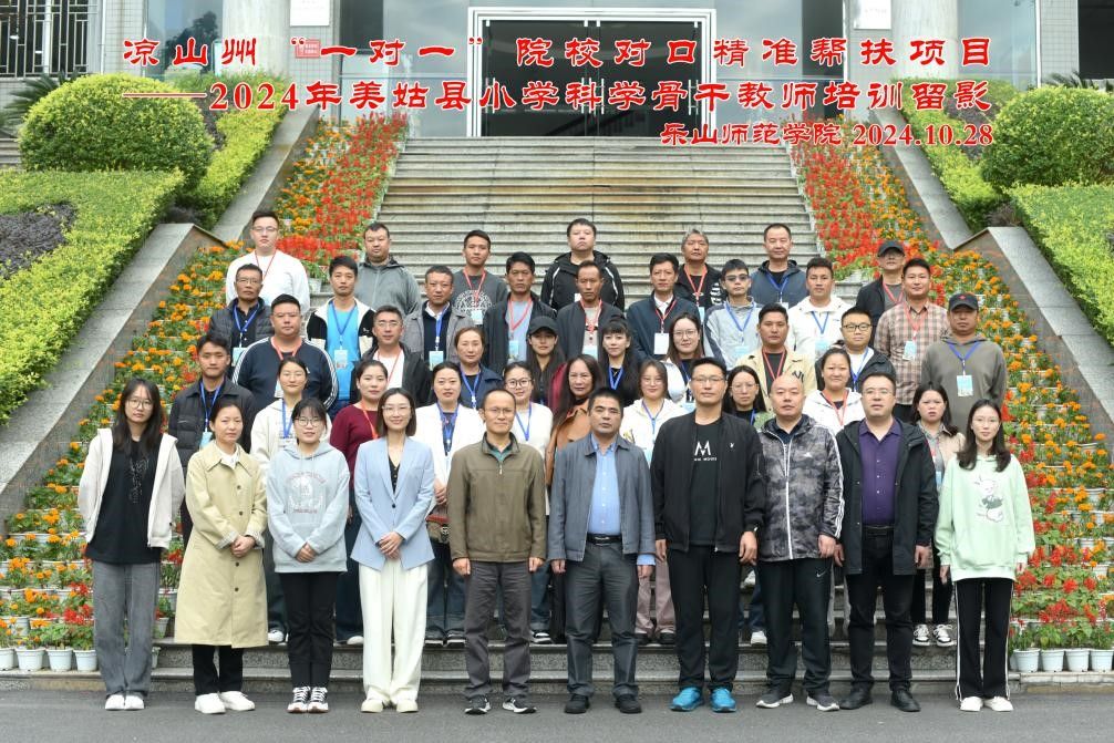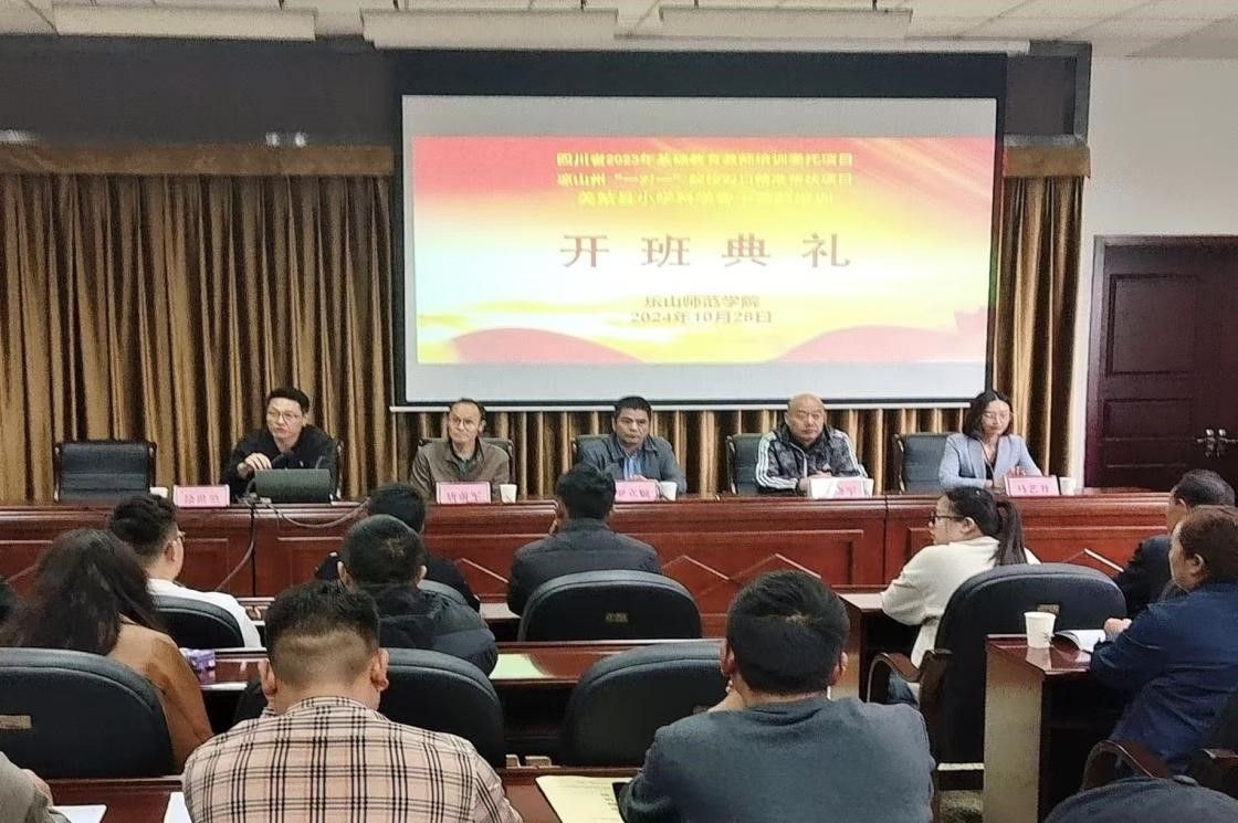 本网讯(文图/陈甜)10月28日,由乐山师范学院教育科学学院承办的2023年凉山州“一对一”院校对口精准帮扶项目-美姑县小学科学骨干教师培训”开班典礼在弘毅楼312 教室顺利举行。乐山师范学院教育科学学院党委书记罗立顺,党委副书记、 纪委书记何晓军,副院长唐前军、马艺丹,教师教育教研室主任张广云,实验室办公室老师钟小婷,辅导员杨蕾以及来自美姑县的39名学员参加了此次开班典礼。开班典礼由副院长徐世鼎主持。