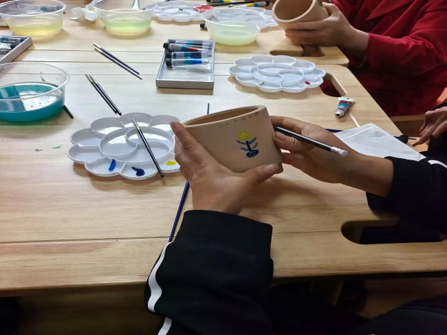 随着轻音乐的响起,潺潺的流水声和鸟鸣声相映成趣,学员们在舒缓的音乐中感受心灵的沉静与安宁,放松心情、缓解压力。随后老师们带领学员进行花盆绘画和多肉种植,学员们积极参与,充分发挥想象力和创造力,在空白的花盆上绘制各式各样的图案,搭配形态、色彩不一的多肉植物,创作并分享属于自己的独特盆栽景观,感受艺术带来的愉悦和成就感,体会到生命的成长与变化。在温馨融洽的氛围中,活动落下帷幕。