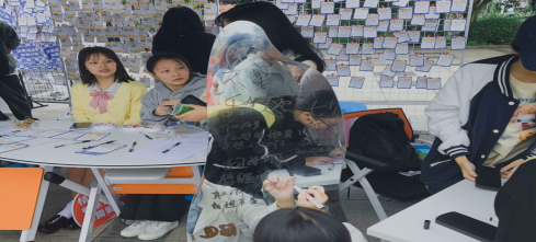 本次主题活动分为四个环节:我最近的心情识别、寄放情绪在云端、情绪能量补给站和镜心相拥自护坊。在心情识别的活动中,社员们邀请同学们在情绪人体图上贴心情色纸,由此引导大家觉察、识别情绪。通过创造舒适、温暖的氛围,鼓励同学们以接纳的态度对待情绪,在书写情绪事件的同时,留意情绪背后的需要。