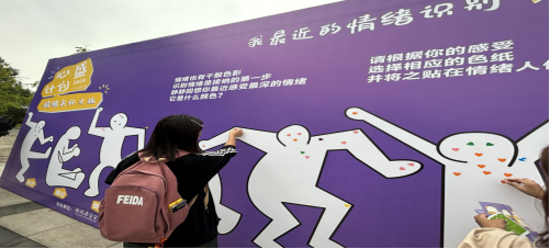 在镜心相拥自护坊的互动中,同学们在镜子上写自己最近今天的坏情绪,在把写在镜子上的内容擦掉,给镜子里的自己或者与烦恼相似的同性陌生人或是好友一个拥抱。同学们开始觉察自己的情绪,同时沉下心来观察和理解他人的情绪,促进心智的提升。