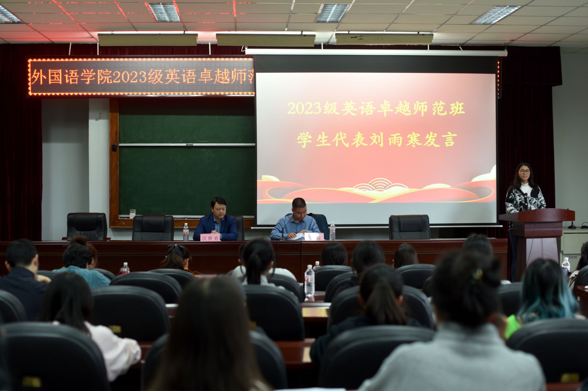 在开班典礼上,江世勇发表了欢迎致词。他对2023级入选英语卓越师范班的全体同学表示祝贺,希望同学们要珍惜学院搭建的平台,充分利用好校内外导师资源,秉承新时代教育家精神,勇于探索,不断创新,鼓励2023级卓越生在大学期间充分发挥自己的潜力,不断提升自己的专业素养和教学能力。校外指导教师代表乐山实验中学教科室副主任刘利华发言,她分享了基础教育一线的教学经验,希望同学们用好资源、虚心求教,主动对接一线指导老师,去一线课堂观摩,反思教学,在专业学习和实践中不断追求卓越,为未来的教育事业做出积极贡献。专业外语指导教师代表王柯芦分享了一些有效的学习方法和经验。她鼓励大家要勇于克服困难,不断提升自己的语言能力、教学能力和创新能力。大学外语指导教师代表谢丽莎发言,介绍了大学外语教学部的基本情况,鼓励大家要主动参与大学外语的集体备课、乐家晨读和四、六级帮扶等活动,拓宽自己的视野。来自2022级英语卓越师范班的学生代表王浩发言。他分享了自己在过去一年中的学习和成长体验,鼓励同学们要积极参与各项活动,主动向校内外导师请教学习。2023级英语卓越师范班的学生代表刘雨寒发言。她表示对入选英语卓越师范班感到无比自豪,并表达了对三方导师们的感激之情,希望能够在各位导师的指导下,为将来成为卓越英语教师打下坚实的基础。徐波介绍了专业外语、大学外语和基础教育一线三方指导教师的职责和任务,并鼓励师范生要不断提升自己的专业水平、教学能力和综合素质,勇于创新,为西南地区基础教育贡献力量。最后,指导教师与师范生们进行了面对面交流。为师生双方提供了互相了解和沟通的机会,也为今后的学习与实践互动奠定了基础。