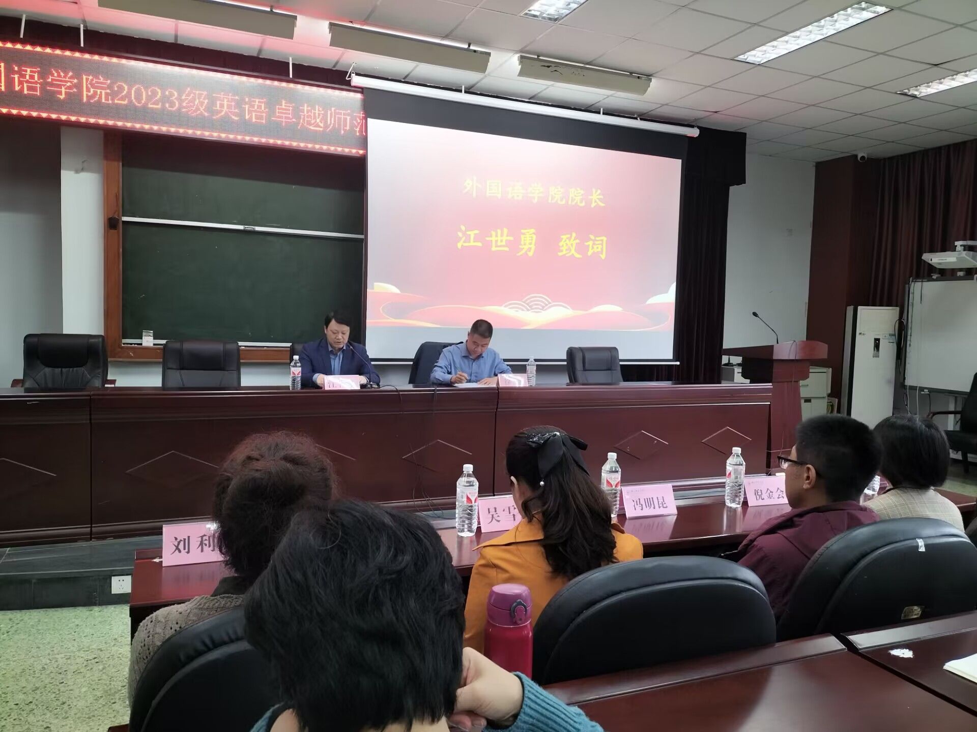 本网讯(文、图/景爱民)10月31日,外国语学院在弘毅楼412室举行了2023级英语卓越师范班开班典礼暨校内外导师见面会。学院院长江世勇、副院长徐波、校内外18位导师以及2023级英语卓越师范班学生参加了见面会,见面会由徐波主持。