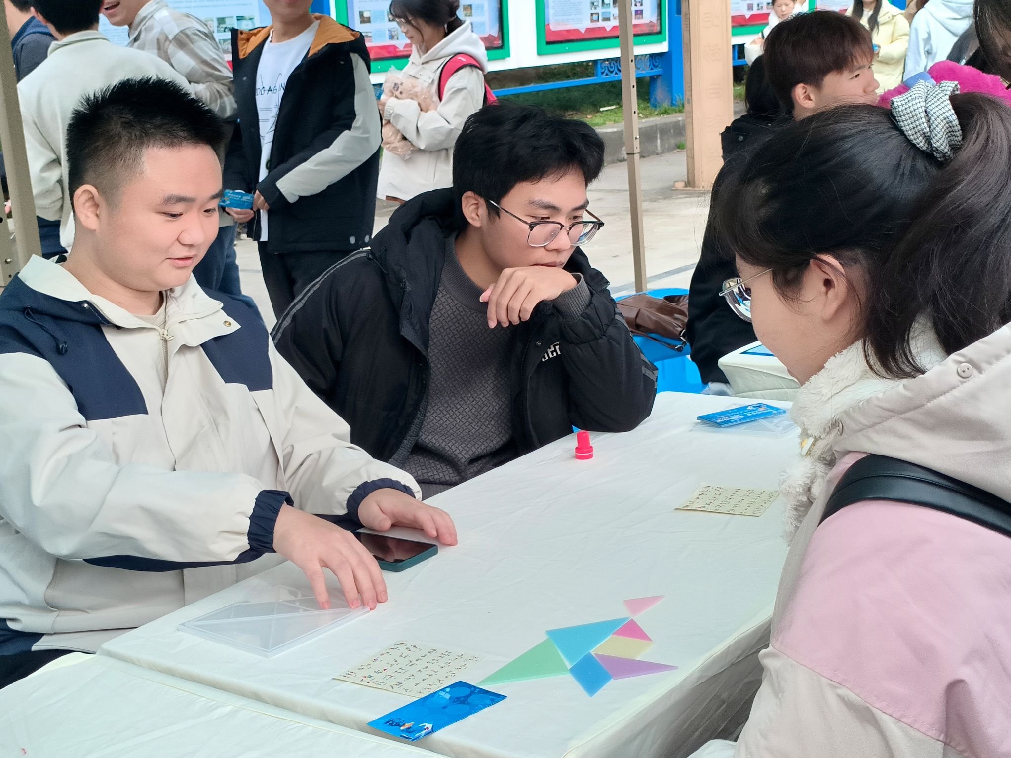 数理嘉年华展区以集章打卡为线索,设置速算24点、趣味七巧板、夹乒乓球、.幸运数字、火柴人数字等10多项不同难度的趣味数理游戏,让师生在在游戏中体验数理乐趣、锻炼数理思维,感受数理魅力。