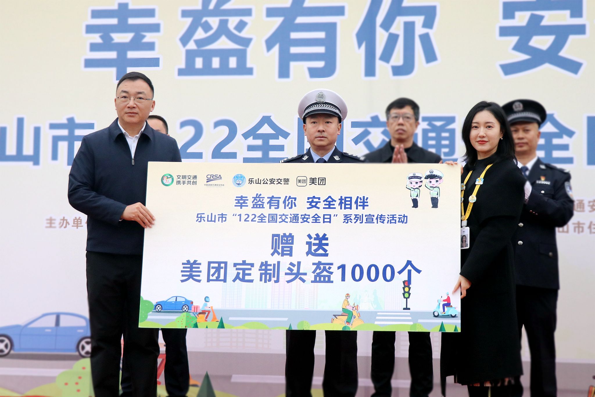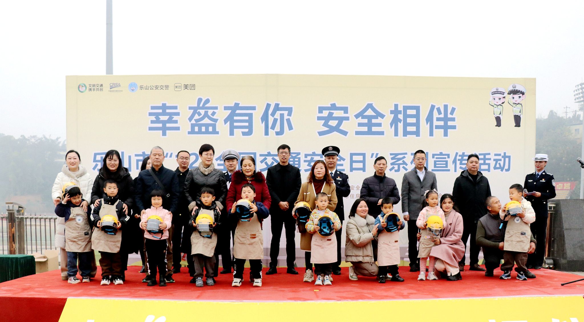 现场,各位领导为学生、乐山师范学院附属幼儿园家长代表赠送头盔。活动结束后,老师和学生积极了解学习交通安全知识,并在宣传立牌旁合影留念。