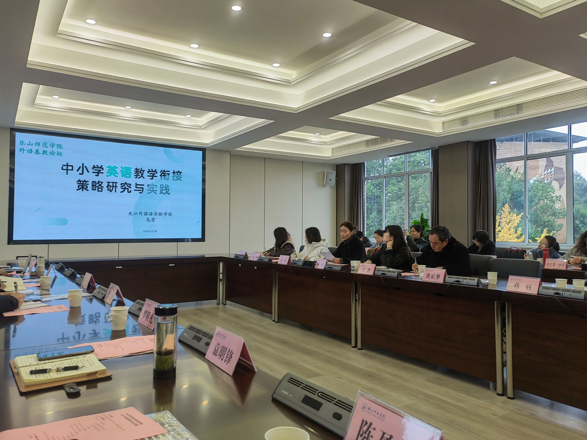 在自由发言环节,与会嘉宾围绕数智化时代背景下的师范英语人才培养模式改革、英语师范生实践教学管理改革、大中小英语教学衔接策略探索与实践等议题展开了交流与讨论。乐山市草堂高级中学副校长蒋羽介绍了草堂高中在英语师范生实践教学管理中的举措和成效。夹江外国语实验学校教科室主任毛宏分享了夹江外国语实验学校在中小学英语教学衔接方面开展的探索,主要包括教学内容与策略、教学方法、评价体系、心理适应与情感支持、家校合作与共同关注等方面的衔接。乐山一中英语教研组组长肖雪介绍了乐山一中与乐山市实验中学在初高中英语教学衔接方面开展的调研和合作规划,表示今后双方将在网络教研、课题研究、校本开发等方面加强研讨。