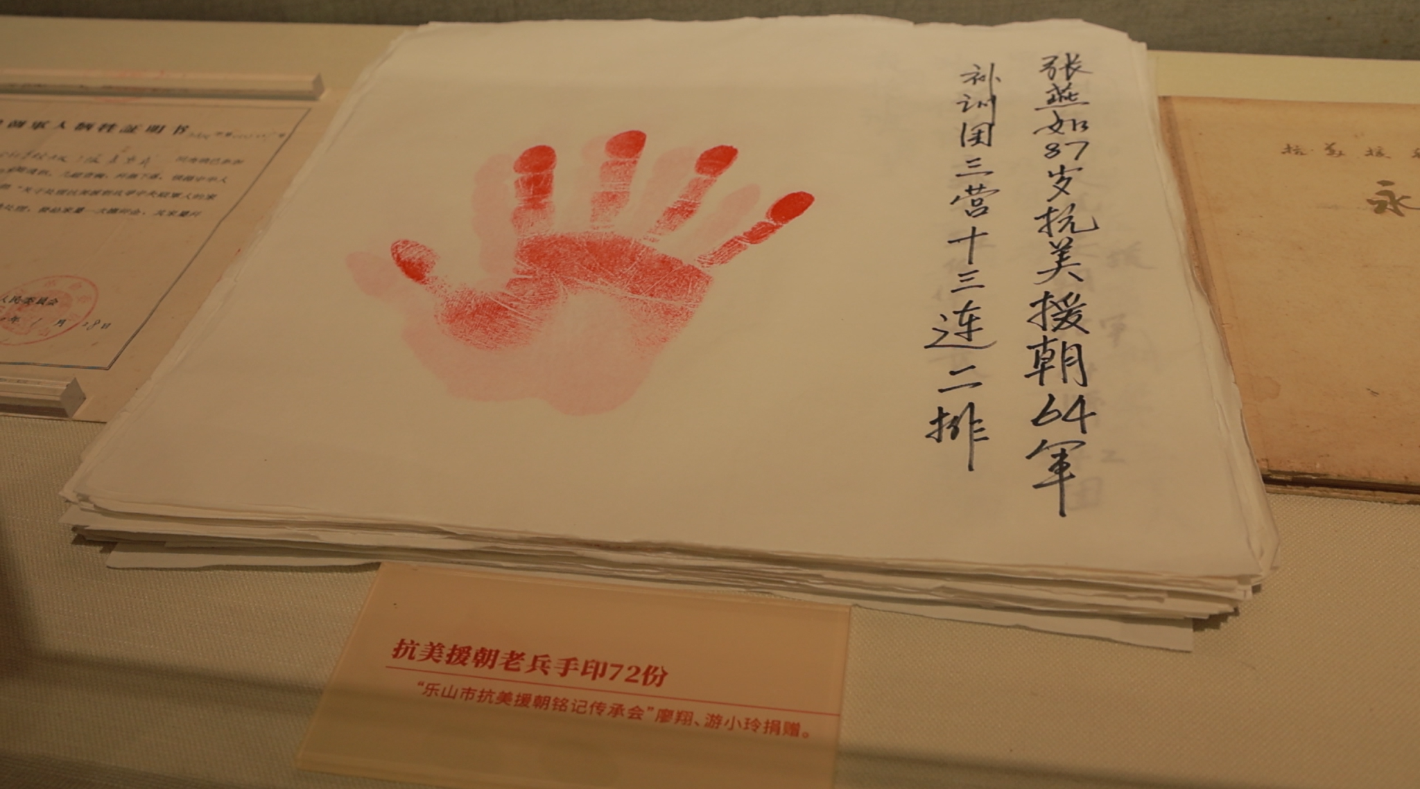 参观的最后,队员们都不约而同地驻足在一叠放有抗美援朝老兵红色手印玻璃展柜前。见到了乐山市传承铭记会所捐赠的熟悉的手印,队员们都很高兴,因为作为乐山市传承铭记会的青年志愿者,能够在建川博物馆见到这份手印,这说明,我们所做的事情是有意义的,抗美援朝精神将更加深入人民群众之中!而这份手印在时光流逝,昔日老兵逐渐离去的情况下,显得弥足珍贵。这也是我们铭记传承的意义所在,无论岁月如何变迁,抗美援朝精神永垂不朽。