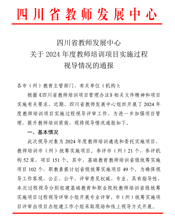 本网讯(文图/沈妍)为进一步加强教师培训项目管理,提升教师培训质效,2024年12月以来,四川省教师发展中心组织开展了2024年度教师培训项目实施过程的视导评审工作,视导对象包括2024年度教师培训遴选和委托实施项目,以及教师培训市(州)统筹实施项目。我校有2个遴选项目、2个委托项目接受了项目实施过程视导评审。