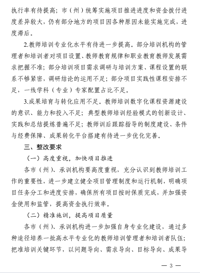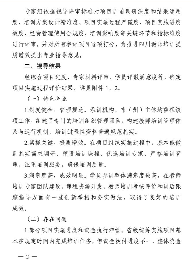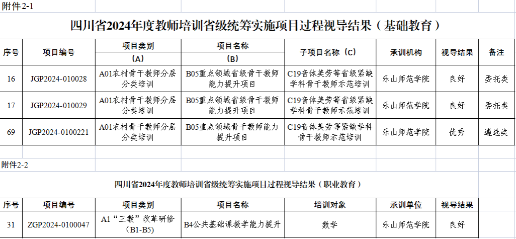 根据四川省教师发展中心2025年2月8日发布的《关于2024年度教师培训项目实施过程视导情况的通报》,我校2024年度4个教师培训项目获得1个优秀、3个良好的佳绩。其中,音乐学院承训的遴选类基础教育项目JGP2024-0100221-C19音体美劳等紧缺学科骨干教师示范培训(美育浸润计划-义务教育段学校音乐学科骨干教师),实施过程视导结果为优秀;数理学院承训的职业教育项目ZGP2024-0100047-B4公共基础课教学能力提升(数学)、特殊教育学院承训的委托类基础教育项目JGP2024-010028-C19音体美劳等省级紧缺学科骨干教师示范培训(特殊教育专业骨干教师专项——特殊教育资源中心管理者培训)和JGP2024-010029-C19音体美劳等省级紧缺学科骨干教师示范培训(随班就读骨干教师示范培训——普通学校承担特殊学生随班就读教育教学工作的学科教师),实施过程视导结果为良好。