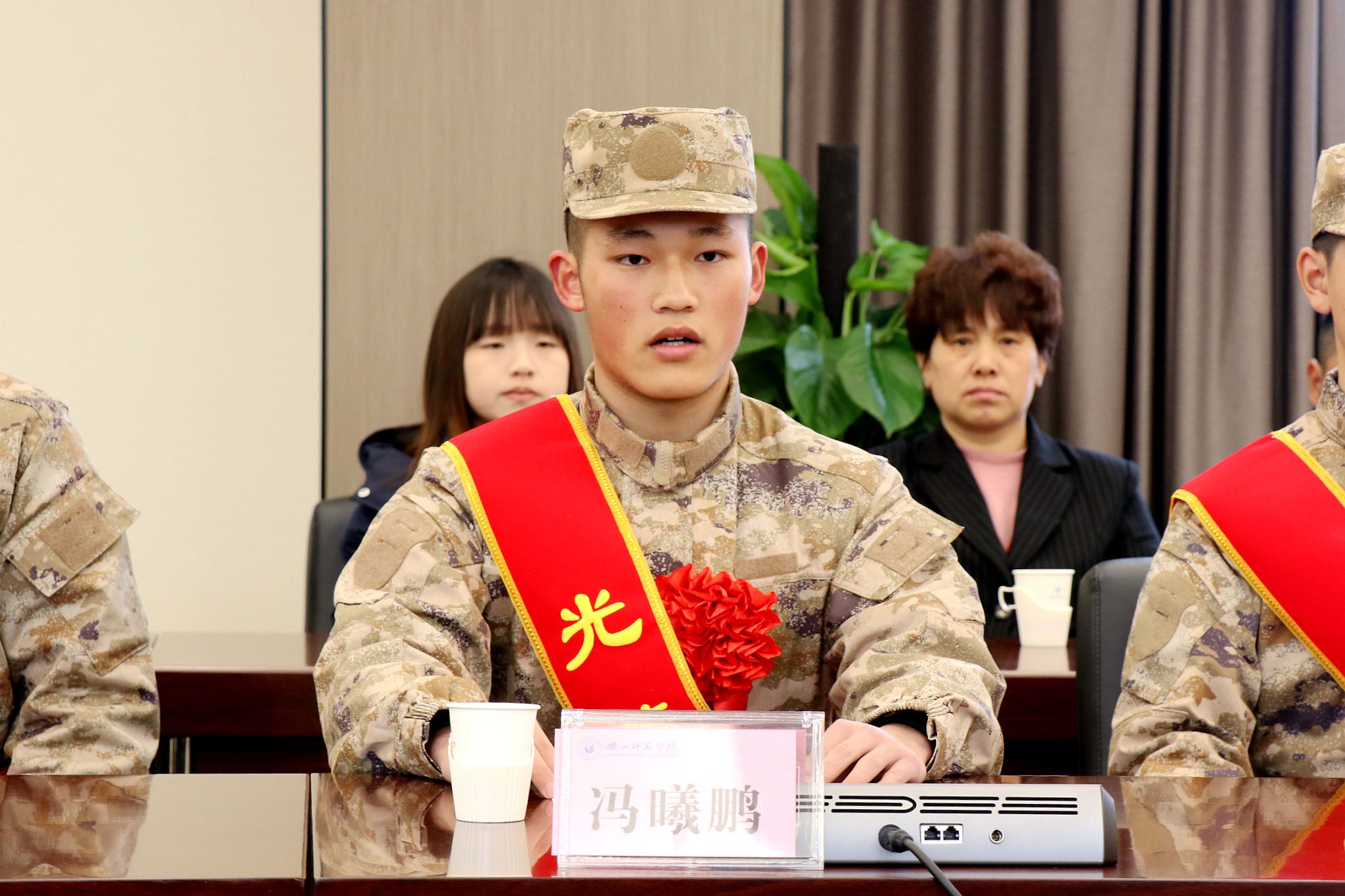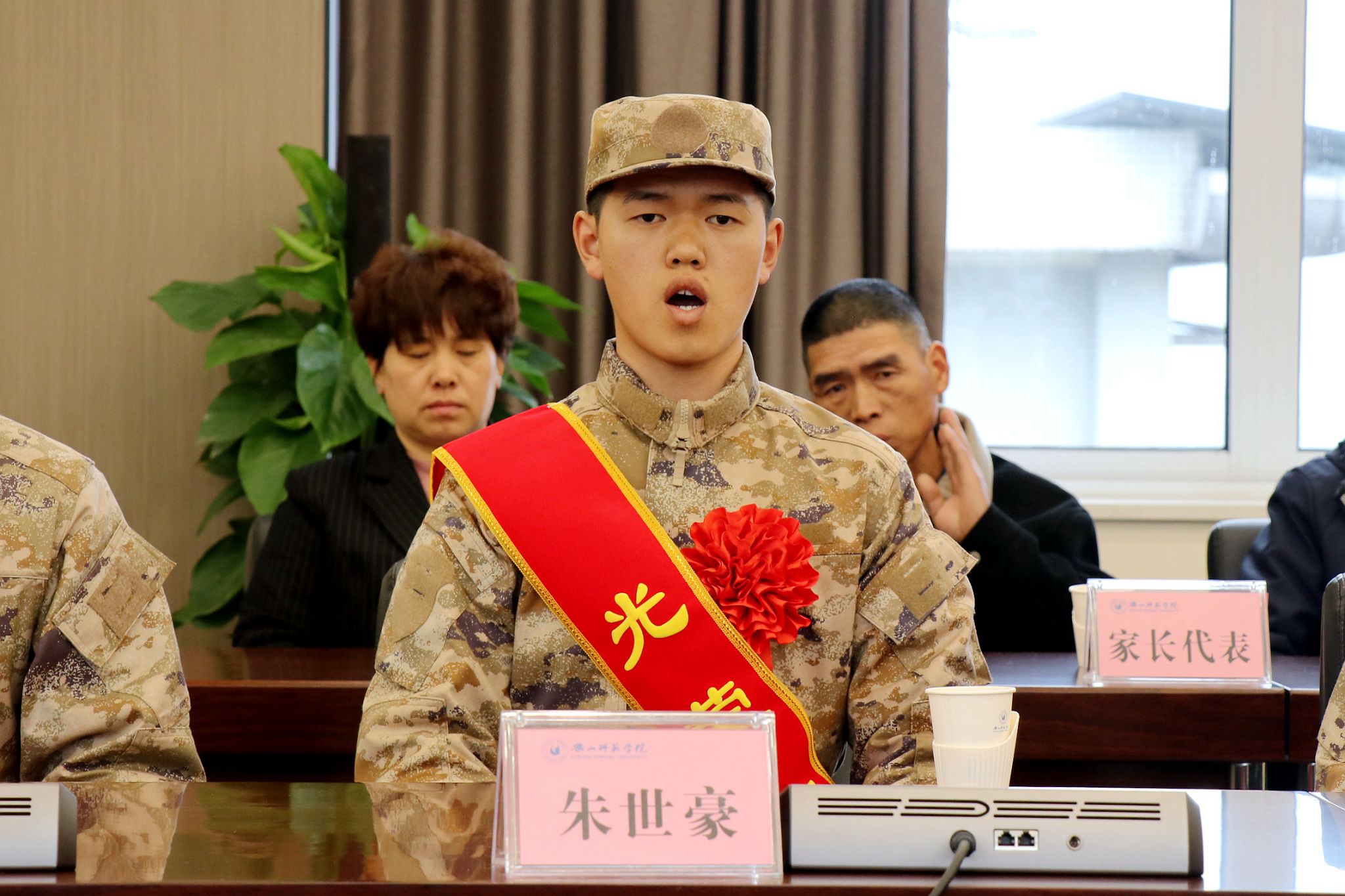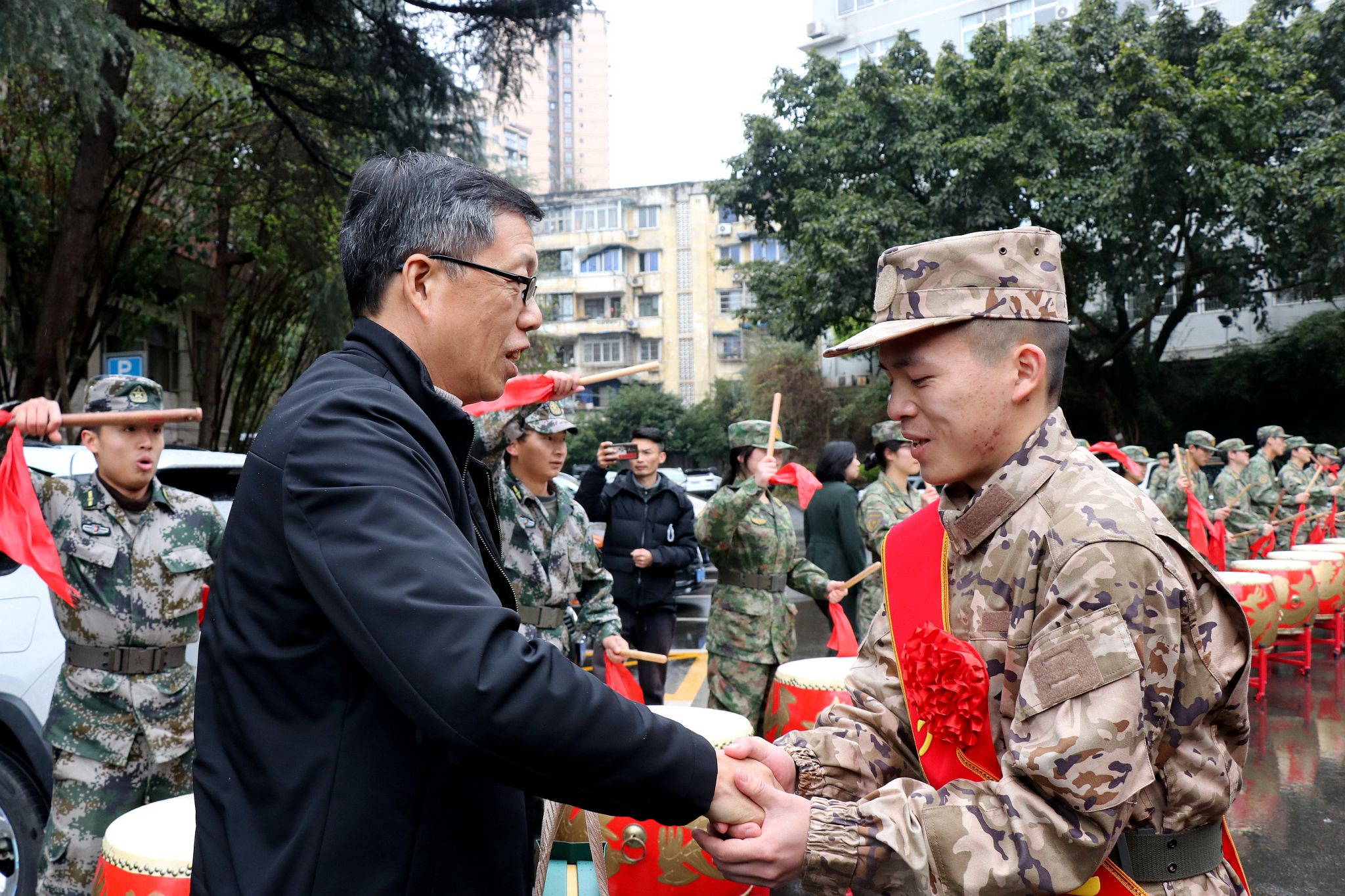 李朝晖为新兵佩戴光荣绶带,代表学校党委向他们表示祝贺,对即将踏入军营的同学们提出期望:要坚定理想信念,听党指挥、筑牢军魂,做一名忠诚的军人;要勤练军事本领,做一名有本事的军人,要不畏艰险,敢于担当、勇往直前,始终以顽强的毅力迎接挑战,还要加强学习,将自己锻造成德才兼备的专业化、高素质新型军事人才;要心存感恩,做一名有情怀的军人。