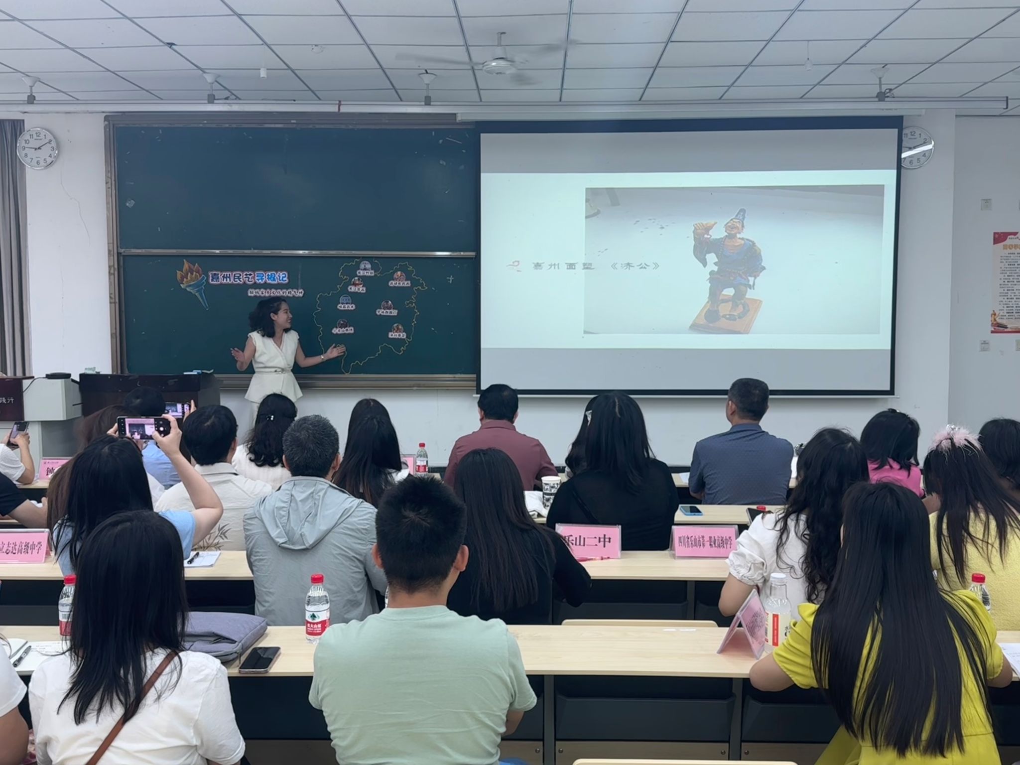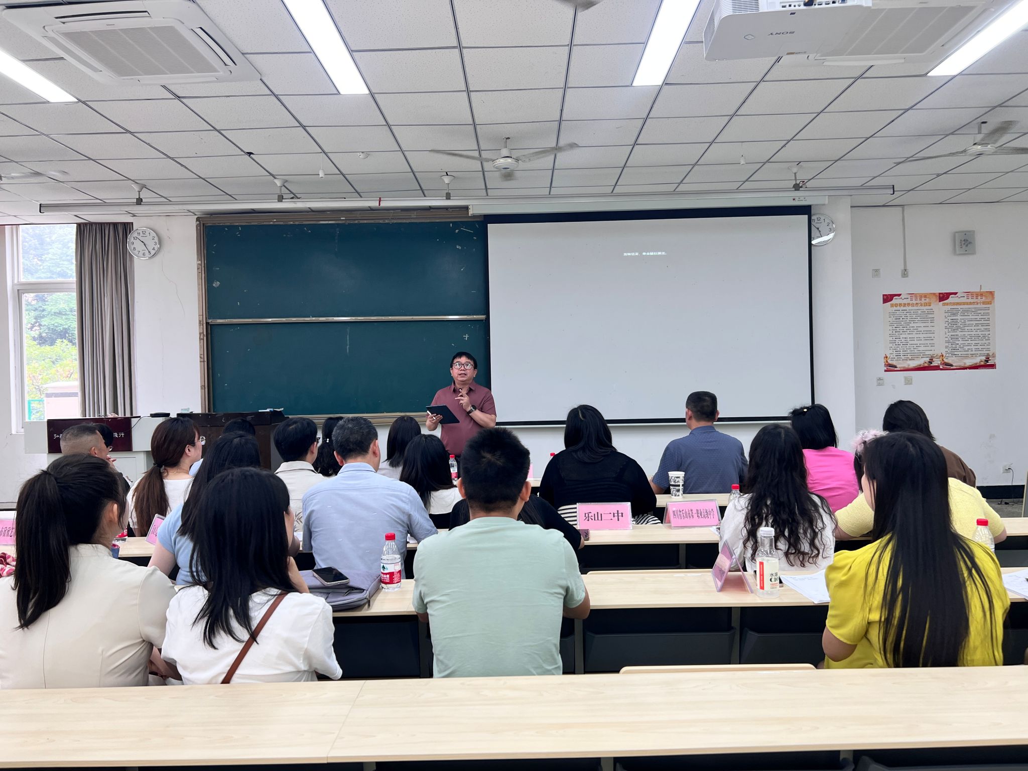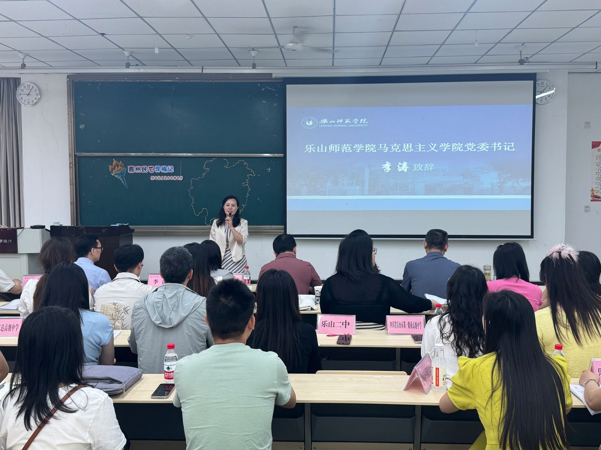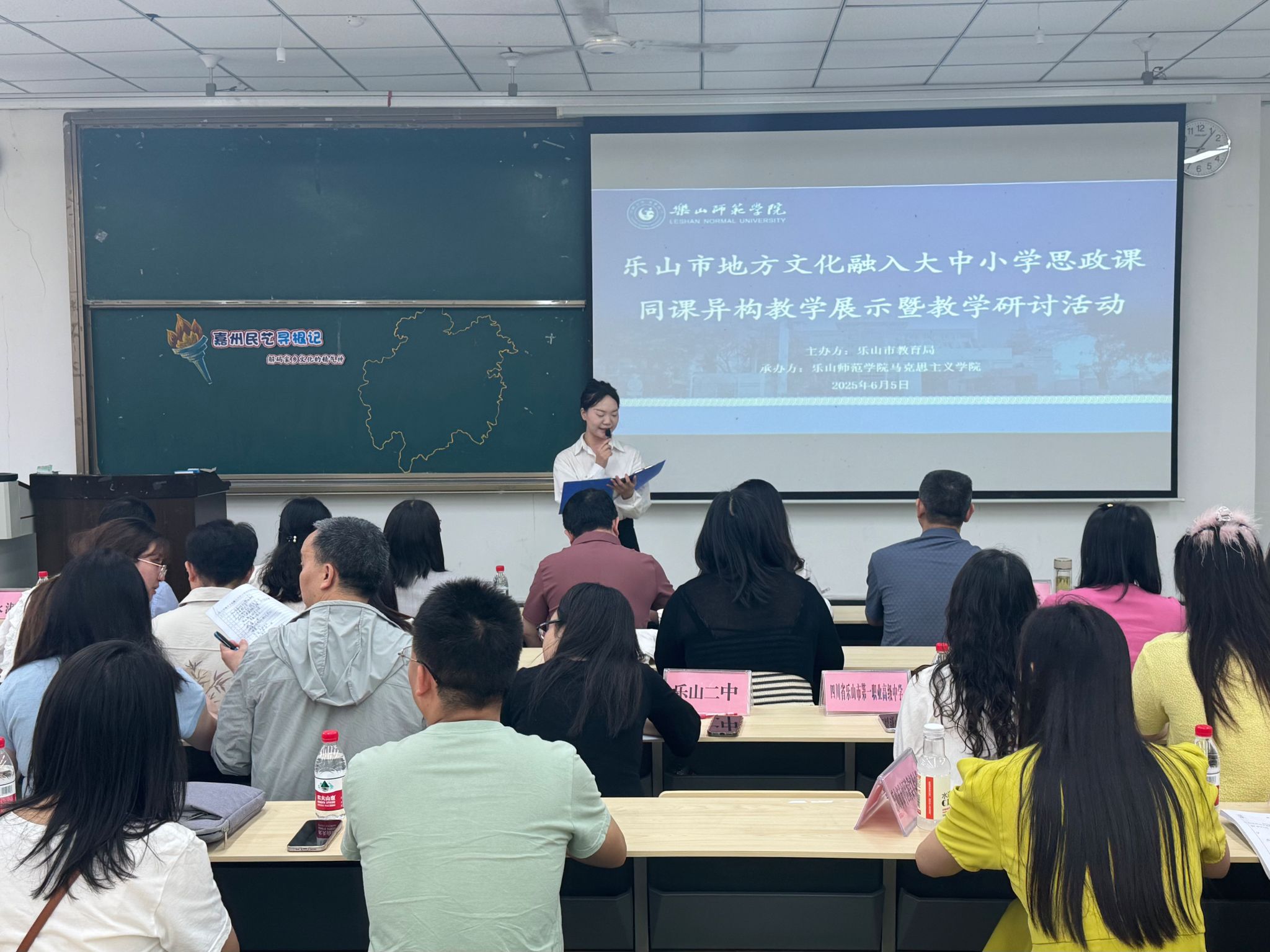 本网讯(文图/魏逍)6月5日上午,乐山市2025年“乐山市地方文化融入大中小学思政课”同课异构教学展示暨教学研讨会活动在我校顺利举行。浙江绍兴文理学院马克思主义学院党委书记陈红,乐山市教科所、乐山一中党委书记许泽能,乐山职业技术学院马克思主义学院院长刘倩、乐山师范学院马克思主义学院党委书记李涛、乐山师范学院马克思主义学院院长郑文杰、乐山师范学院马克思主义学院党委副书记钟永淑、乐山师范学院马克思主义学院副院长(挂职乐山市教育局副局长)赖伟,以及全市各小初高学段思政教师代表齐聚一堂。四川科技职业学院领导和老师通过线上参会。乐山师范学院马克思主义学院师生代表100余人现场参与。