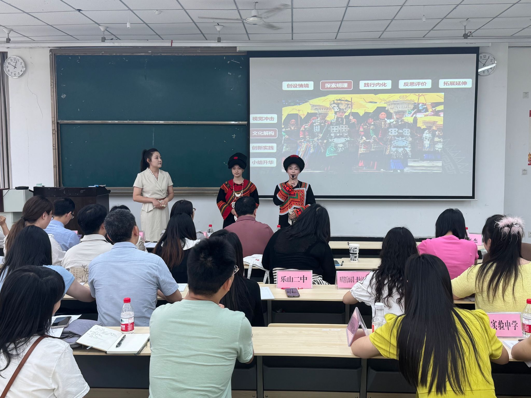 高中组眉山市教师采用说课的方式进行课堂呈现。从创设情境、探索明理、践行内化、反思评拓展四个环节,引导学生认识彝族服饰,了解彝族文化。课中,身着彝族服饰的学生现场展示,让学生具象化地感知彝族服饰文化,并通过设计实践活动,引导学生团结协作,思考如何让传统文化“活”起来,培养学生文化自信与创新意识。