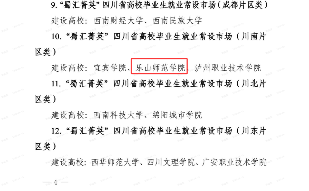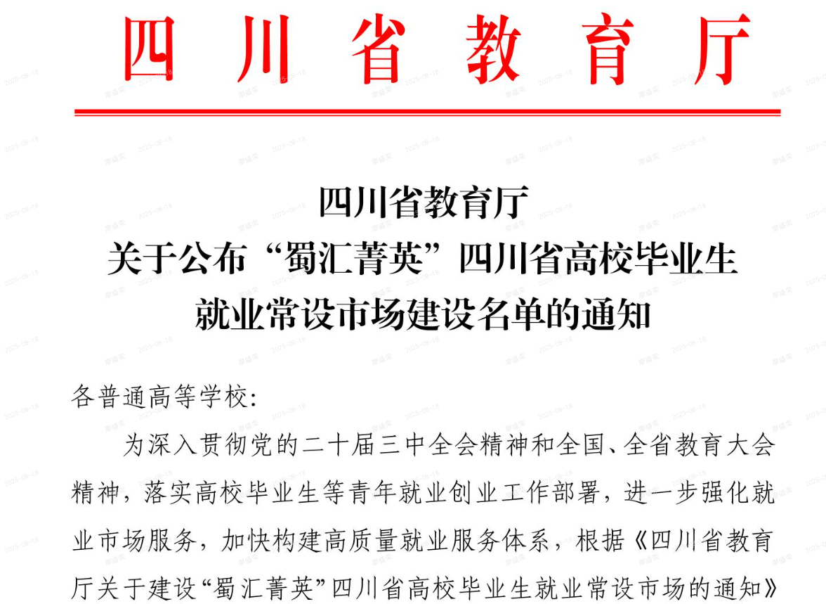 本网讯(文图/刘桐江)近日,四川省教育厅印发《关于公布“蜀汇菁英”四川省高校毕业生就业常设市场建设名单的通知》,全省共有33所高校入选,涵盖电子信息、装备制造等12类区域性、行业性常设市场。通过申请评选,我校作为川南片区类高校成功入选,成为服务区域高校毕业生就业的重要力量。