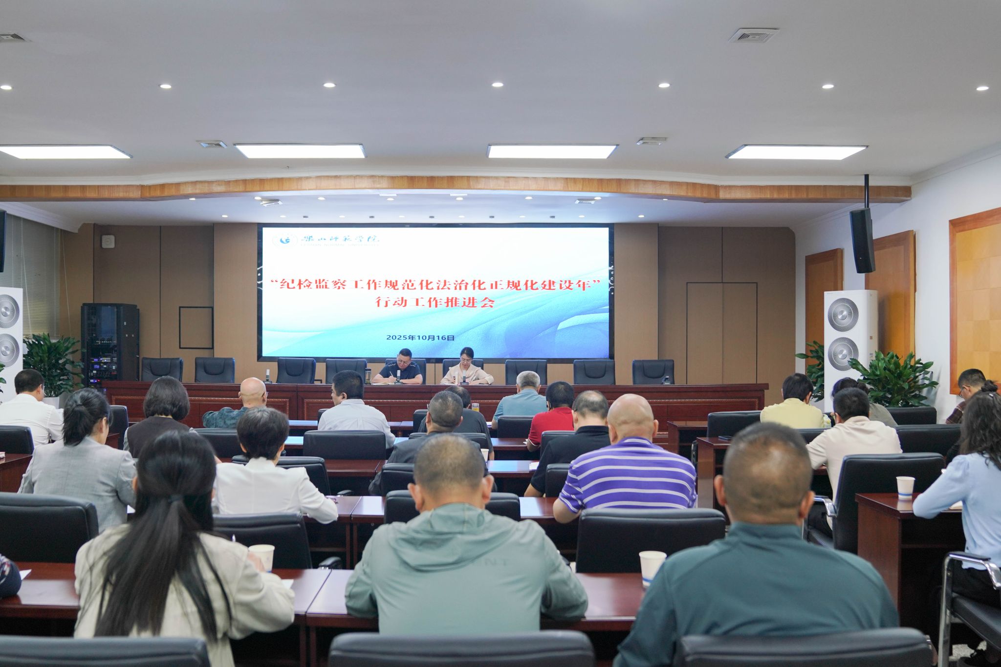 本网讯(文/贾云强 图/曾仁丽)10月16日,学校“纪检监察工作规范化法治化正规化建设年”行动工作推进会在弘毅楼第三会议室召开。校纪委委员、二级纪委书记(党总支、直属党支部纪检委员)、特约监察员、纪委办全体人员参会。驻校纪检监察组副组长、纪委副书记、纪委办主任郭晓黎主持会议。