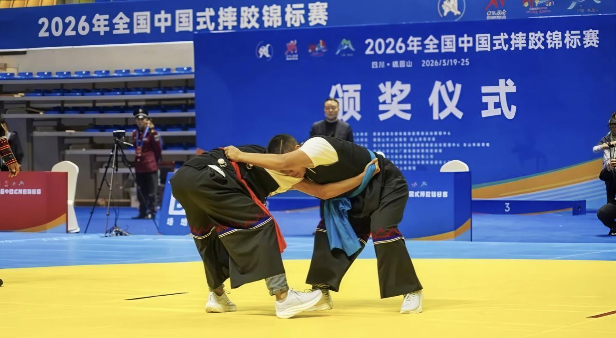 本网讯(文/张锶沁 图/微峨眉)3月22日至24日,2026年全国中国式摔跤锦标赛在峨眉山体育馆举行。赛事由国家体育总局举重摔跤柔道运动管理中心主办,乐山师范学院、峨眉山市人民政府联合承办。来自全国各地的300余名选手参赛,年龄覆盖18至45岁,共设男子10个级别、女子8个级别。