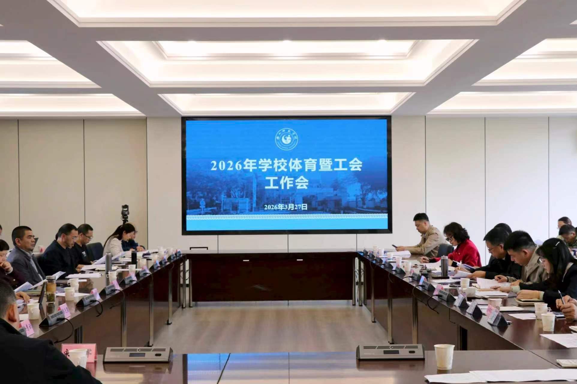 本网讯(文/陈小剑 图/张锶沁)为深入贯彻落实“健康第一”教育理念,统筹推进学校体育工作与工会工作高质量开展,3月27日,2026年学校体育暨工会工作会在弘毅楼第一会议室召开。党政办等相关职能部门负责同志,各教学院党委书记、党委副书记及各分工会主席参会,会议由党委常委、副校长、工会主席李朝晖主持。