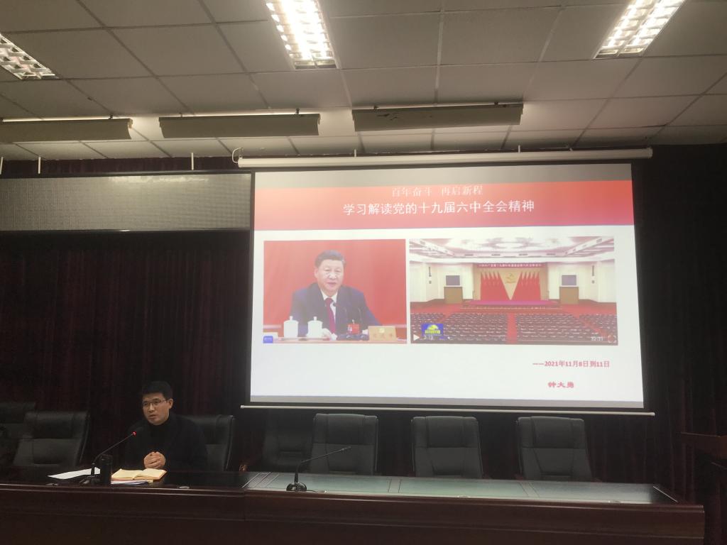 首先,党总支副书记(主持工作)钟大勇结合十九届六中全会公报和《中共中央关于党的百年奋斗重大成就和历史经验的决议》对十九届六中全会精神进行了宣讲,着重从三次马克思主义指导思想的新飞跃、四个历史时期、百年奋斗的五个历史意义、十条历史经验进行了讲解。接着,钟大勇介绍了乐山市第八次党代会的主题、任务,围绕全市未来发展的“345”工作思路、奋斗目标和主要任务对乐山市第八次党代会精神进行了宣讲。