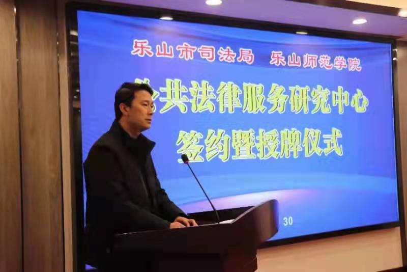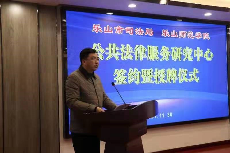 本网讯(文、图/董璐)11月30日,乐山市司法局与乐山师范学院公共法律服务研究中心签约暨授牌仪式在乐山市公共法律服务中心举行。乐山师范学院副校长汪天飞,中共乐山市委宣传部副部长夏建新,市委依法治市办主任、市司法局党委书记、局长杨伟出席活动并致辞。