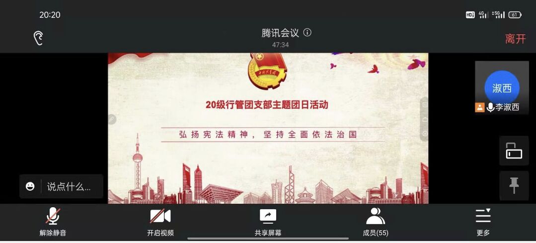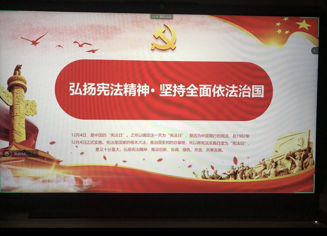 本网讯(文、图/杨兵)在12月4日第八个国家宪法日来临之际,为弘扬宪法精神,增强法治意识,法学与公共管理学院于12月1日至3日以班为单位召开了“弘扬宪法精神,坚持全面依法治国”主题班会,法管学院全体学生通过线上、线下分别参与了主题班会。