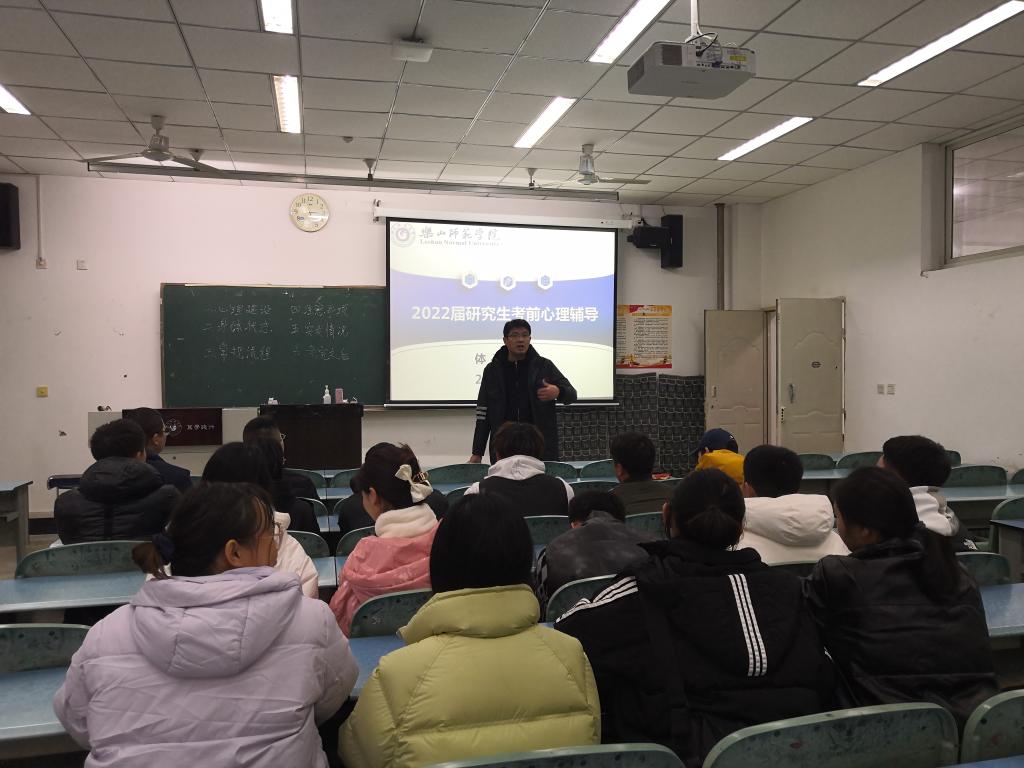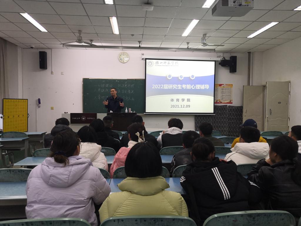 本网讯(文、图/杜小敏) 12月9日,体育学院邀请孟凡帅老师在行知楼110教室为2022届考研学生做考前心理辅导,副书记(主持工作)钟大勇、副书记陈勋玮出席。
