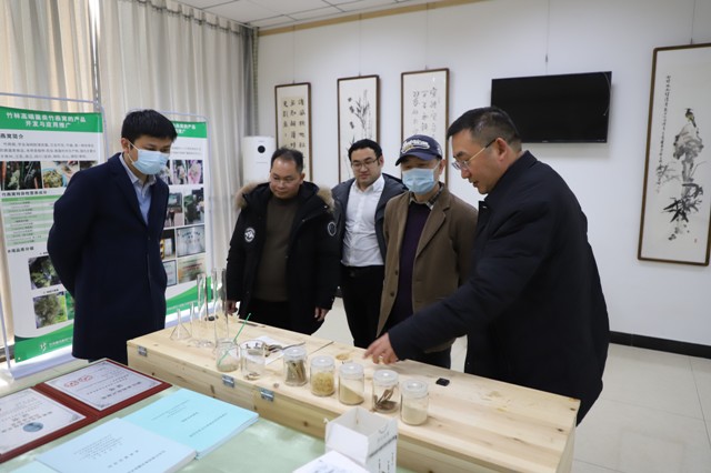 孙蒙祥教授听取了杨瑶君汇报省重点实验室研究方向以及取得的科技成果后,与实验室骨干成员共同参观了竹类四川省重点实验室研发产品的成果展示,在学术报告厅,孙蒙祥教授充分肯定了实验室取得的系列成果,并从加强竹类基础研究,从分子阐述竹类与害虫、竹类林下产品开发技术等进行了全程指导。