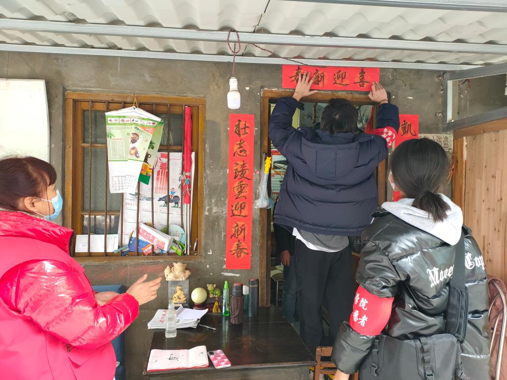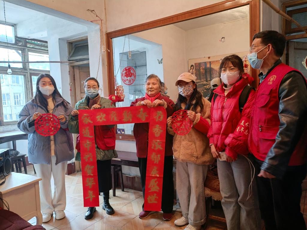 剪纸、写对联活动结束后,志愿者们去看望了社区的空巢老人。其中,有94岁高龄的爷爷,子女长期外出工作,缺少陪伴,志愿者们由社区工作人员带领,为其送上新年祝福。志愿者们热情与老人聊天并热心地为老人贴春联及窗花,为老人带去关爱与温暖,整个氛围其乐融融。