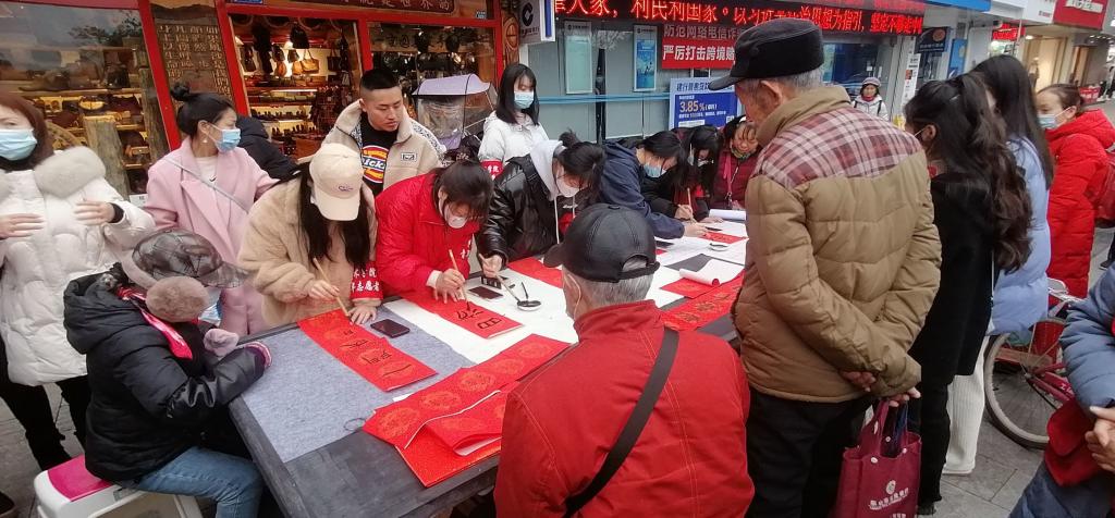 社区实践活动开始前,美术学院和社区志愿者们一起用剪纸、书法资料及“青春志愿·爱在社区”的横幅布置场地。活动中,水井冲社区的老人、儿童及路过的行人都被志愿者们的剪纸和对联所吸引,纷纷驻足观看。美院志愿者们发挥自己的专业特长,为社区居民送上新年祝福。