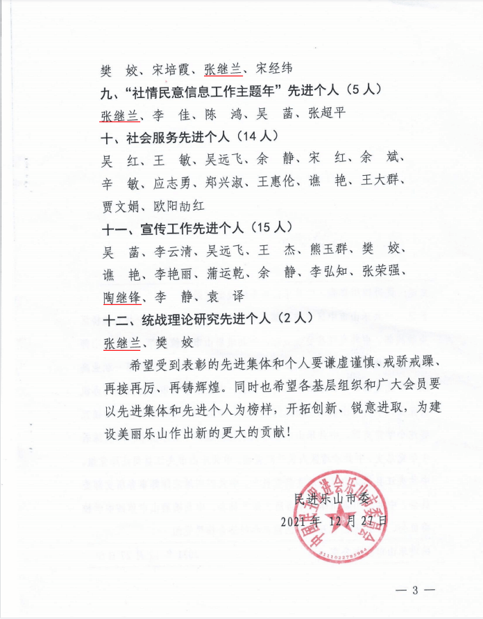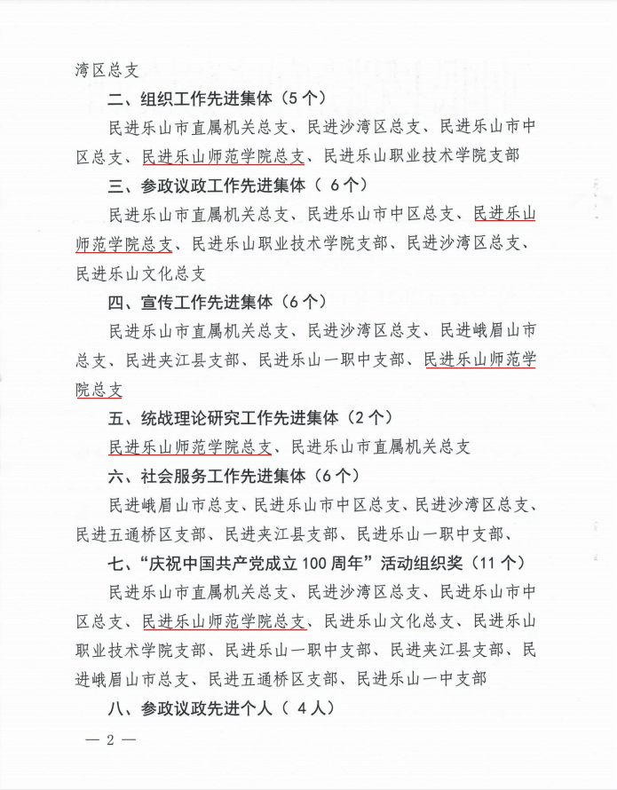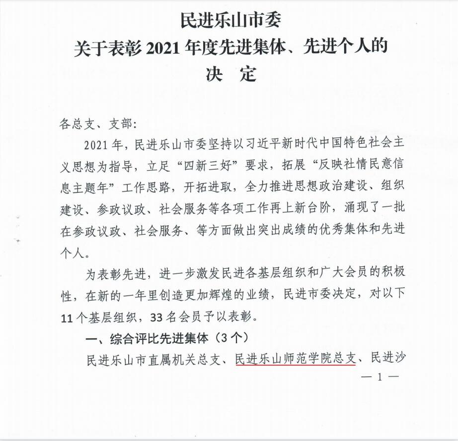 本网讯(文、图/黄渝婷) 2021年12月27日,民进乐山市委表彰2021年度先进集体、先进个人。我校民进总支囊括全市民进“综合评比先进集体”“组织工作先进集体”“参政议政工作先进集体”“宣传工作先进集体”“统战理论研究工作先进集体”“‘庆祝中国共产党成立100周年’活动组织奖”等6个集体奖,实现民进总支获市上表彰史上第一次大满贯。