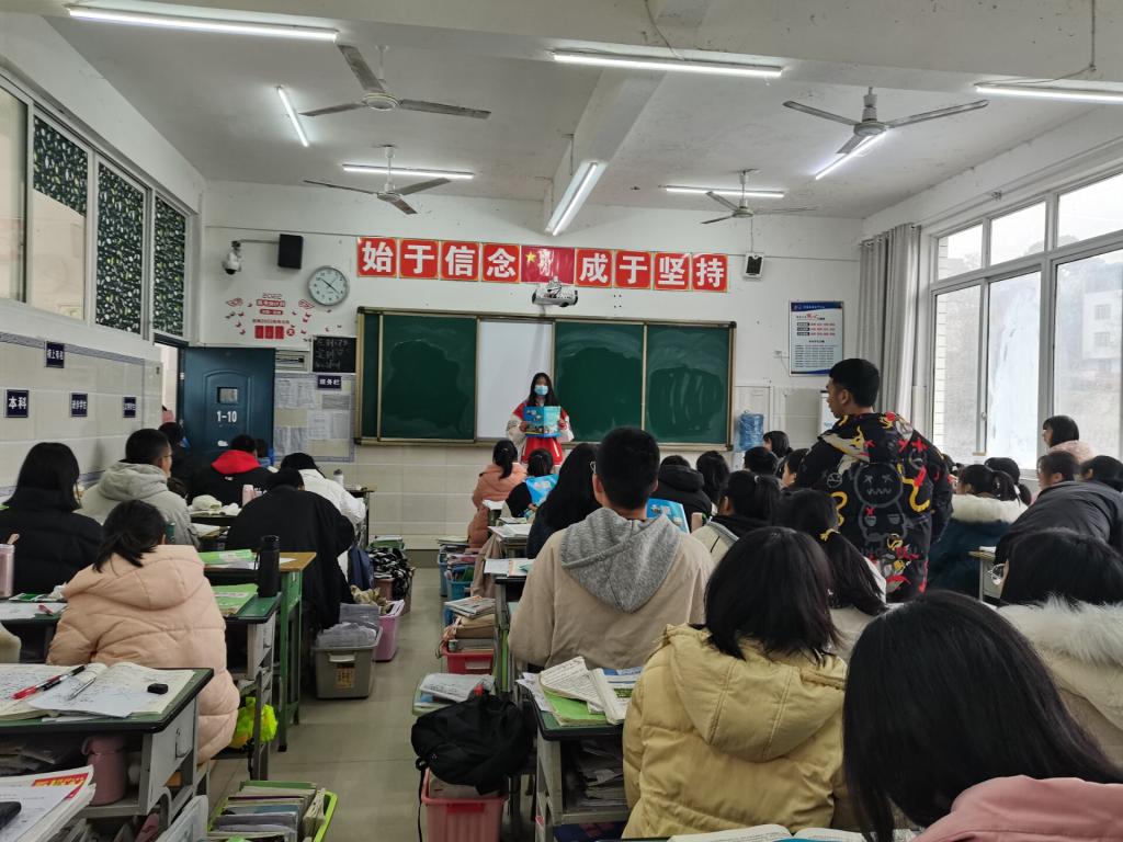 在泸县四中,学生党员罗荣红介绍了我校的办学成就与特色、报考条件、招生和资助政策、校园环境等,与学弟学妹们分享了曾经的高中经历与备考经验,并探讨目前就业形式。通过图片与视频引发大家对大学的向往,为即将进行二诊考试的高三学子加油打气,激励他们以今日的努力圆明日的大学梦,去往更高远更广阔的舞台实现人生理想。