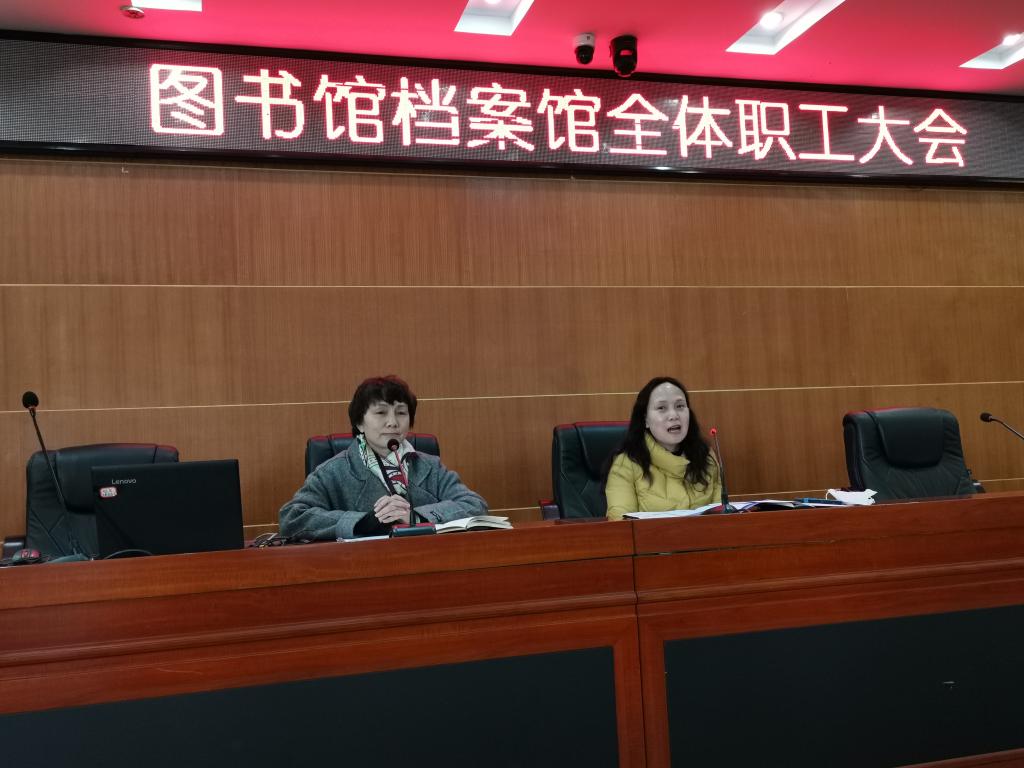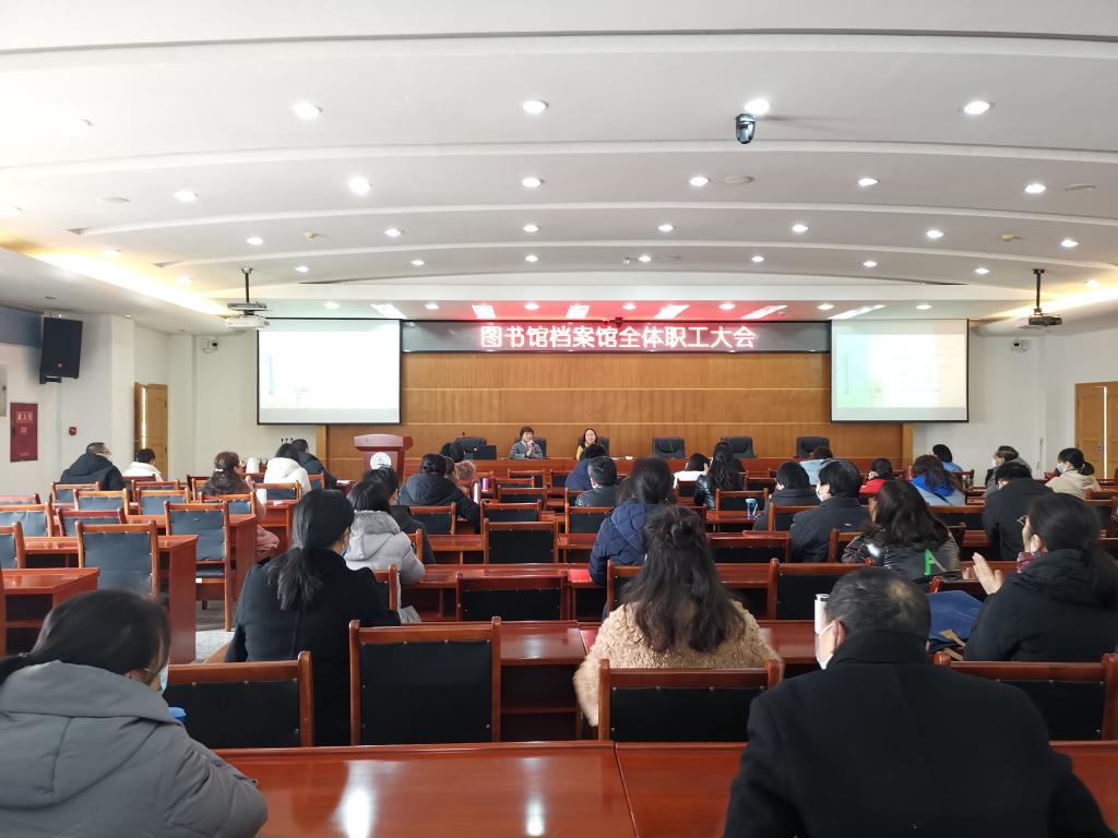 本网讯(文、图/舒宇)2月24日下午, 图书馆、档案馆在图书馆五楼学术报告厅召开了新学期第一次全体教职工大会,会议由图书馆、档案馆直属党支部书记张静主持。