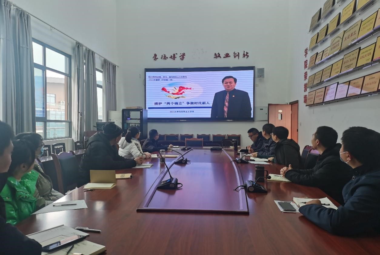 在蒋强的组织下学院全体师生采取多种形式学习了四川省大学生春季开学第一课。学院中心组采取集中方式学习了由四川大学罗静等3位老师主讲的2022年四川大学生春季开学第一课。3位老师分别从“两个确立”的生成依据、伟大意义和现实践行三个层面进行了深入的讲解。学院各级学生通过手机等方式积极参与学习并在网络上进行了互动。