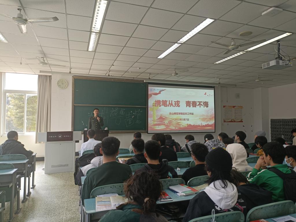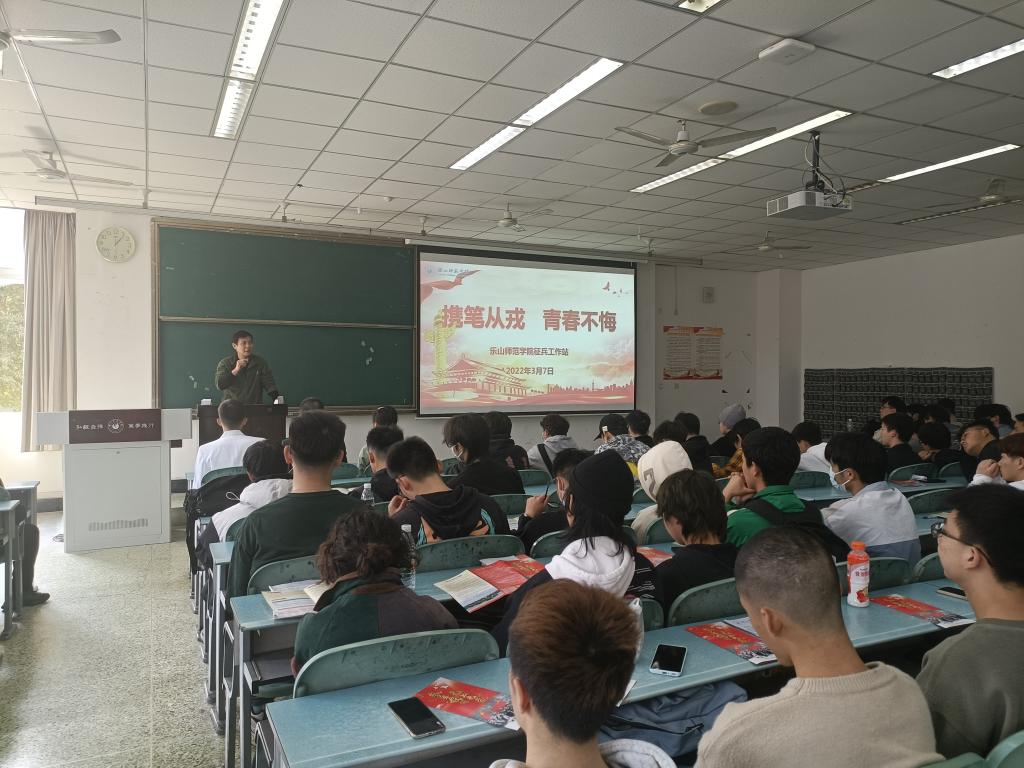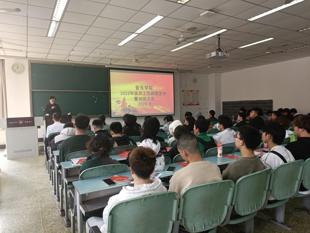 本网讯(文/罗智勇、图/郭元红)3月9日中午,音乐学院在行知楼101教室召开征兵政策宣讲和动员大会。音乐学院党总支书记罗谊恒、党委武装保卫部副部长梁光德、保卫处徐凌云、音乐学院2021级辅导员郭元红、全院男生。会议由音乐学院学生科科长罗智勇主持。首先,罗谊恒解读了国务院、中央军委发布的2022年征兵文件,习近平总书记对新时代军人的要求,党的十八大以来,一系列涉及军人地位和权益保障的法规,大学生参军入伍的使命、义务。并希望同学们积极主动参与征兵工作中来,为国家的利益和个人的发展做好正确的选择。