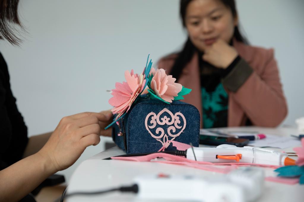 在静心放松后,老师们开始分工合作, 弯折花杆、裁下花瓣、缝制盒身,一片片花瓣交错堆叠,一个个小花蕊在老师精心的制作下变成一束束花朵;针线穿过,一片片不织布变成一个盒子,在花朵与花藤的装饰下,花朵抽纸盒就此诞生。