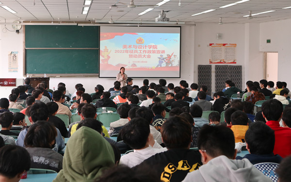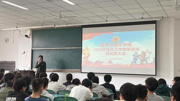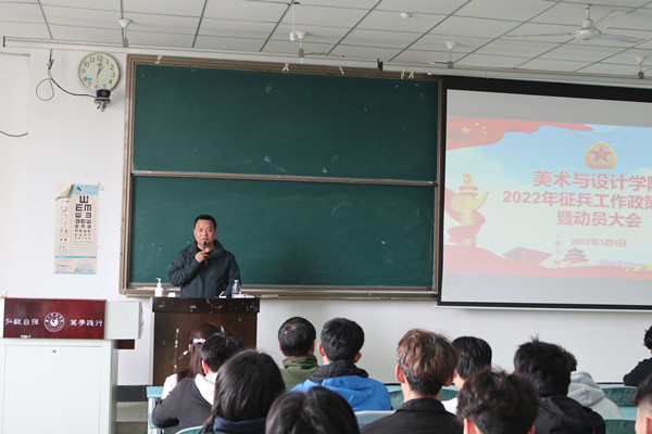 本网讯(文/崔玉图/任自林) 3月9日中午,美术与设计学院在行知楼225教室召开征兵政策宣讲和动员大会,邀请学校党委武装保卫部副部长梁光德、征兵工作负责人徐凌云作国防教育和应征入伍政策宣讲。美术与设计学院党委副书记王孝琴、全体辅导员和在校男生参加宣讲会。会议由王孝琴主持。