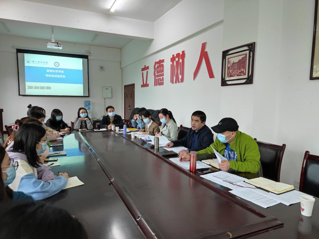 本网讯(文、图/李过、刘燕玲)为帮助2022届考研学子顺利通过考研复试,有效提高录取率,教育科学学院于3月21日举行了考研复试专题指导会。教育科学学院党委书记罗立顺、副书记何晓军、学生科科长杨婷婷、校团委团员青年服务中心主任翟雅媛及全体辅导员老师、30名复试同学参加本次会议。