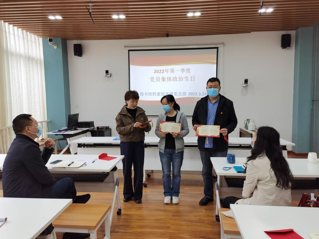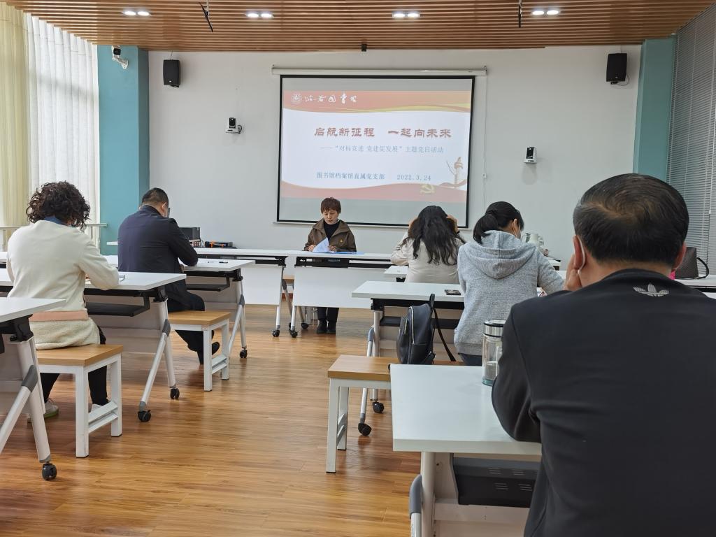 本网讯(文、图/易英霞)2022年3月24日下午,图书馆档案馆直属党支部全体党员在图书馆108室开展了本月主题为“启航新征程 一起向未来”——“对标竞进 党建促发展”的主题党日活动,由直属党支部书记张静主持。