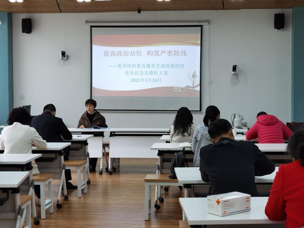 首先,张静传达了学校党委组织部、宣传部近期主要工作部署,以及直属党支部如何落实完成“两个承诺”、“三个计划”、“一个申报”等工作的安排。同时她向全体党员通报了会前支委会审议的相关议题,特别是直属党支部在围绕“对标竞进党建促发展”方面的一些思路、抓手和行动实施方案。接着,她通报了经班子商议、支委会审议通过的成立“图书馆、档案馆疫情防控应急党员先锋队”的方案,向全体党员倡议、动员党员同志切实贯彻、落实学校党委关于疫情防控的相关工作部署和学校安全工作会议精神,“提高政治站位,构筑严密防线”。