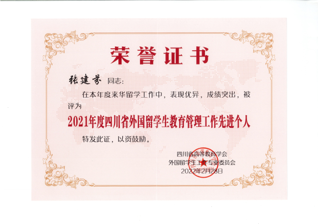 本网讯(文、图/张建芬)近日,国际处收到四川省高等教育学会外国留学生工作专业委员会通知,因在留学生管理工作中立足本职,勤勉敬业,展现了高效务实的良好工作精神,我处张建芬同志荣获2021年度“四川省外国留学生教育管理工作先进个人”称号。