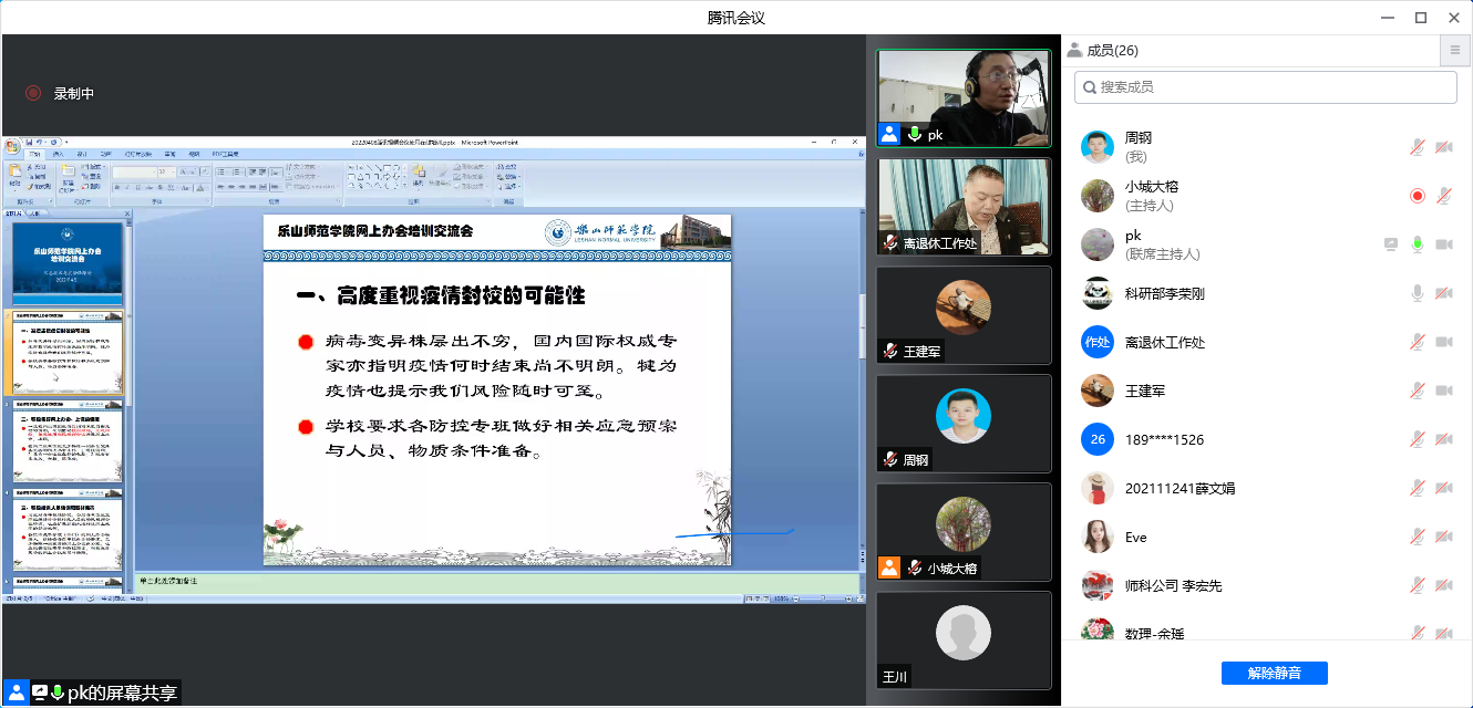 本次培训交流会通过“腾讯会议”软件在线召开,由信实处副处长刘培康主持,各二级单位参会人员在线参加。刘培康在会上强调了三点,一是学校很重视因疫情突发封校的可能性,为此在做积极准备,大家也应引起高度重视,积极配合学校落实疫情应急预案措施;二是为确保疫情封校期间学校事务会议的正常进行,要求统一使用腾讯会议软件平台,信实处将组织各二级单位预先筹备好相关器材;三是请各二级单位明确一位网上办会联络员,以协同做好网上办会的保障,接受学校组织的网上办会、办学培训和技术交流,并组织培训各自单位的教职工。