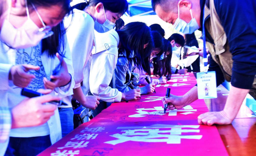 本网讯(文/吴天人 图/徐凌云)今年是我国第七个全民国家安全教育日,为进一步增强大学生国家安全意识,4月14日上午,学校党委武装保卫部在北校区桂花广场开展“国家安全·从我做起”为主题的全民国家安全教育日宣传活动。活动采取以宣传挂画、张贴海报、横幅签名的形式,教育引导广大师生树牢国家利益高于一切的观念,自觉履行国家安全责任,坚决维护国家安全利益。